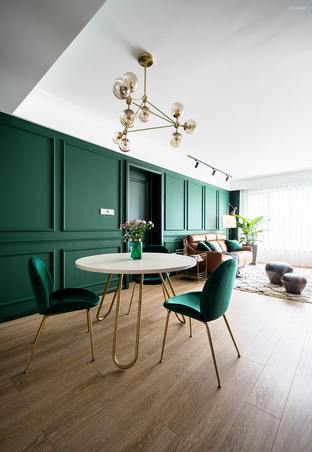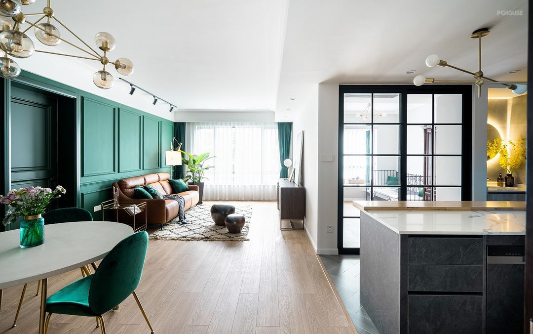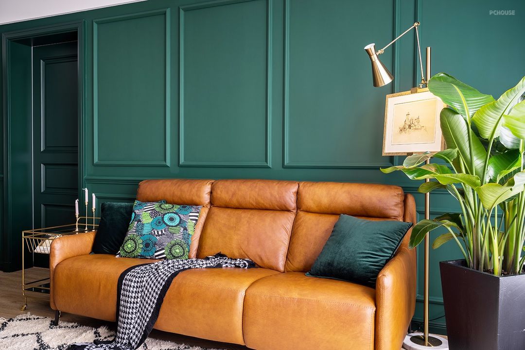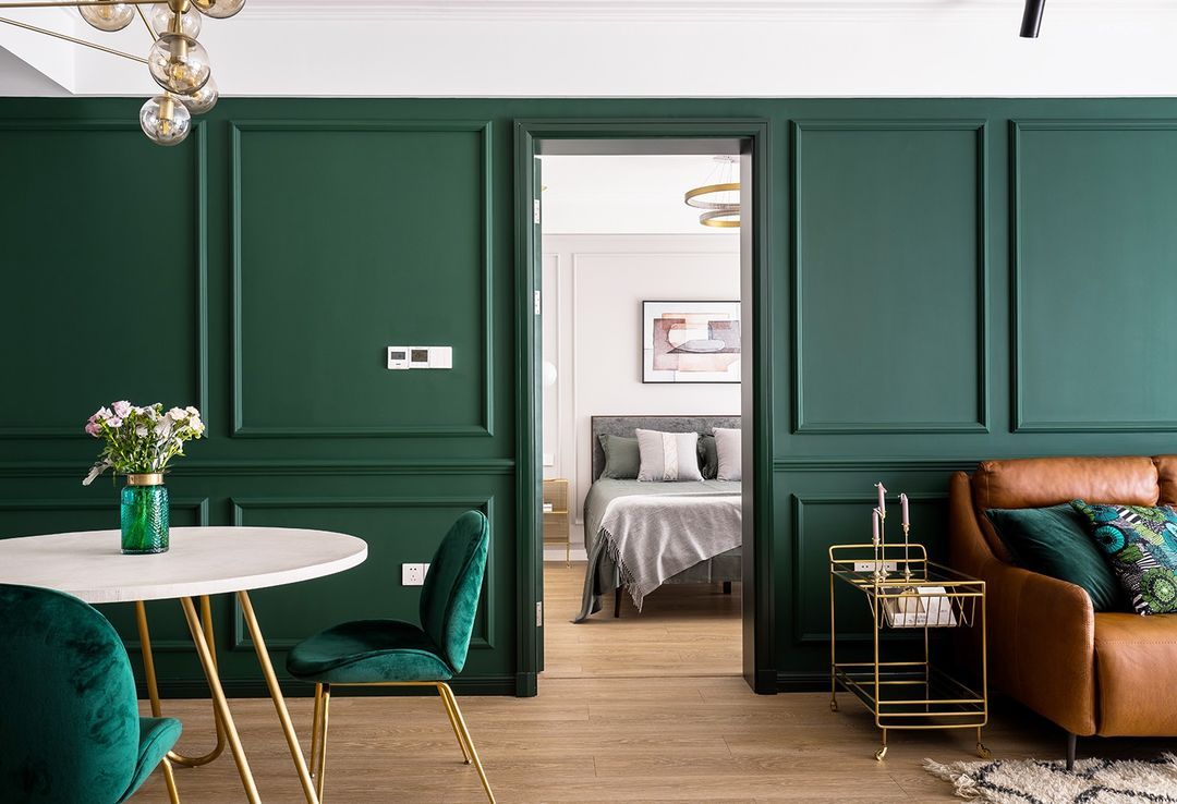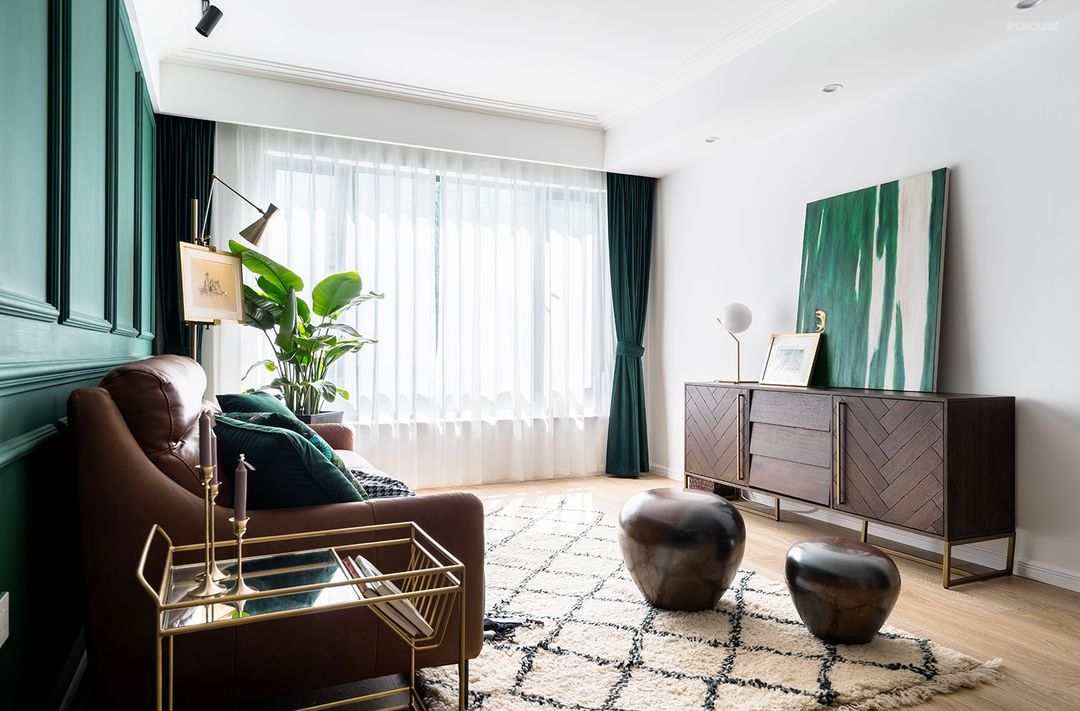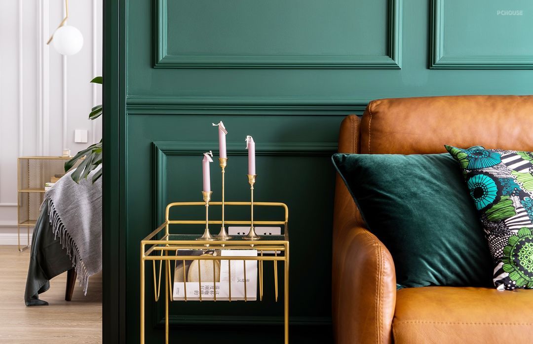 定制的墨绿色木饰面背景墙,浓重而神秘,搭配牛皮沙发和金色几何造型的茶几,使得整个画面高贵典雅,质感满分。