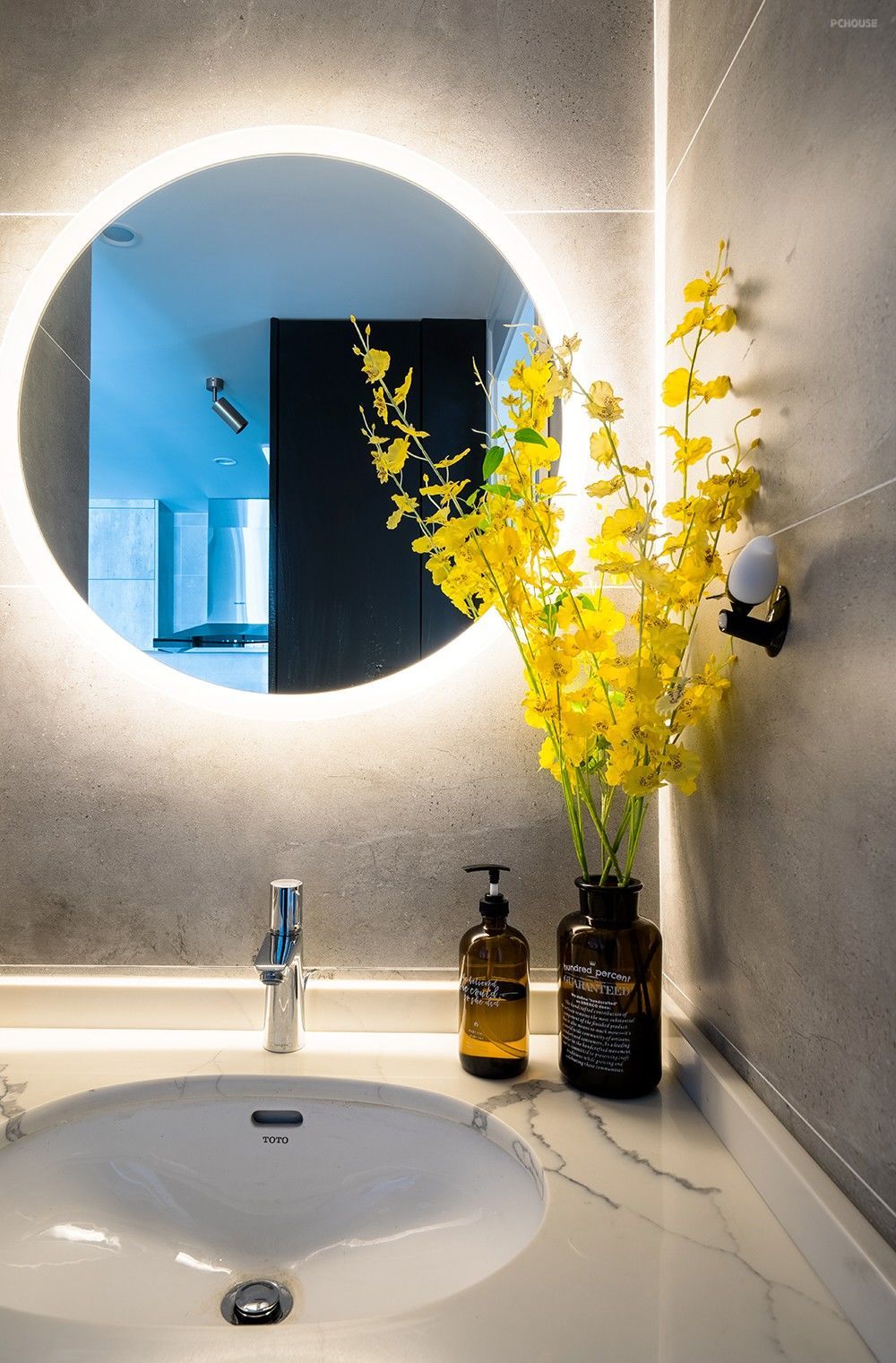 干湿分离的洗手台,圆形无框背光灯很有未来之感,应合了主人“多维-无界”的愿景。