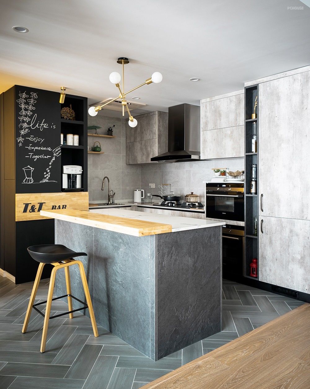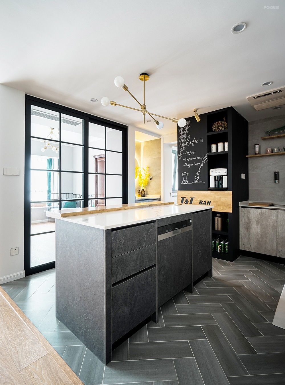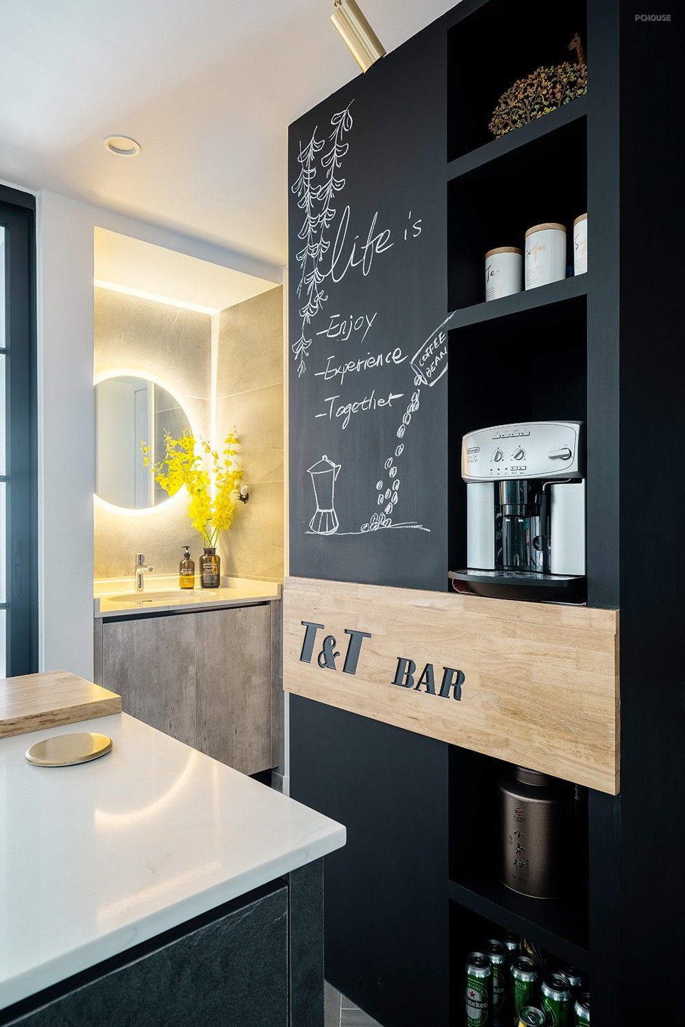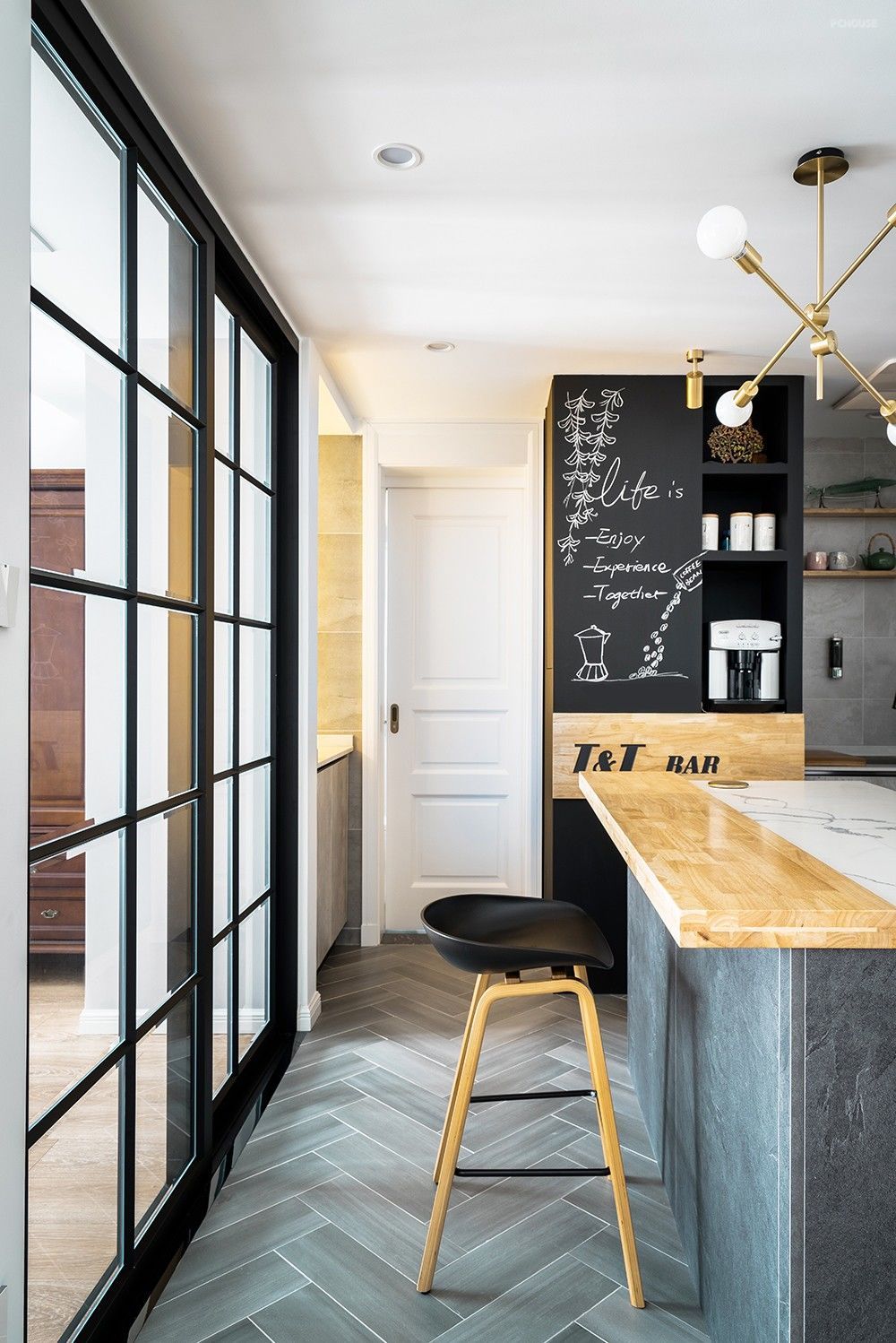 厨房与客卧之间因为有了这个导台而显得格外生动,黑板墙、格子窗、水泥灰和整木的潮流元素在这里擦出精致硬朗的火花,简约大方。