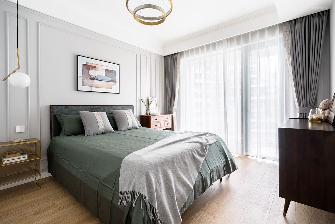 业主夫妇喜好贴近自然,所以客厅里摈弃了以电视为中心的主体结构,以画与高柜代替,更显风雅。窗帘也选用了墨绿色的丝绒,清新的气息铺面而来。