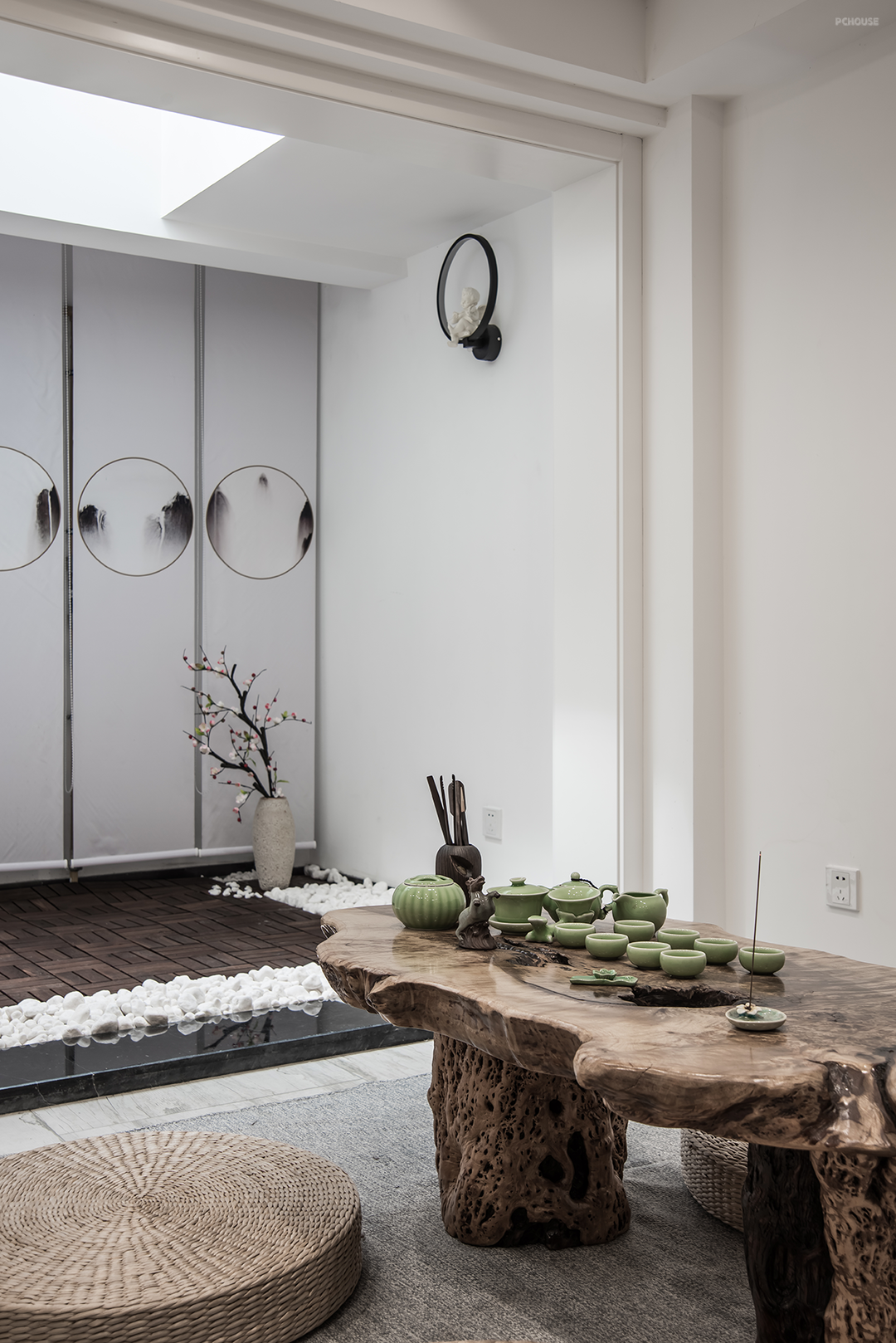 方案上,设计师把地下室部分天井旁作为品茶区域,增加了一块写字区域。一楼部分重新梳理了厨餐区原有的动线关系,也应业主需求增设了入户玄关。二楼卧室分别做了舒适的套房的处理,也满足了业主对于书房的功能的要求。