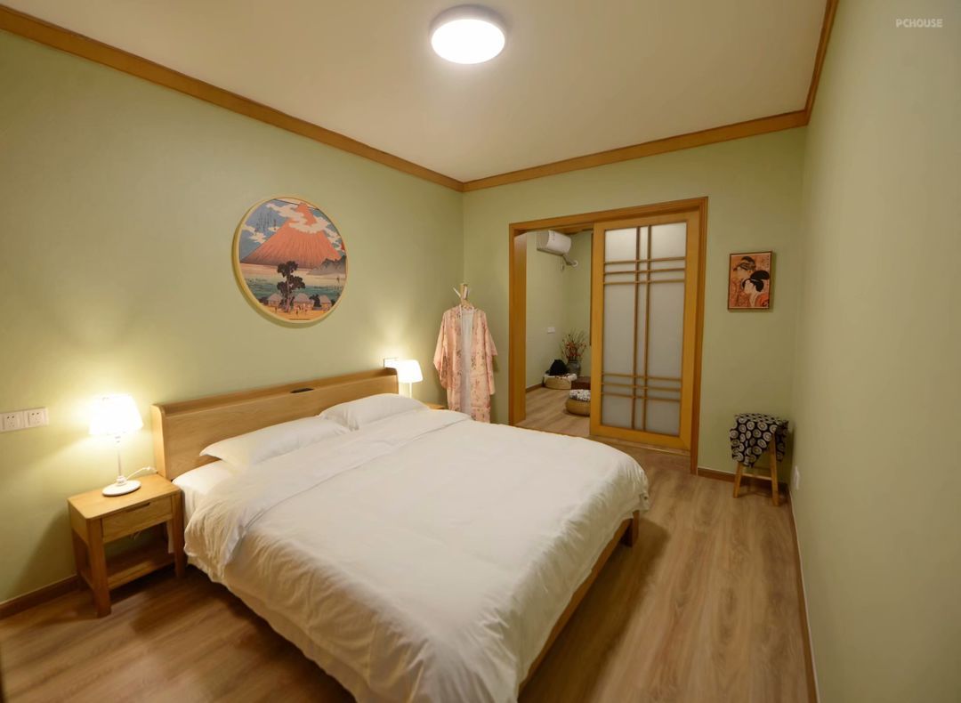因为是民宿,次卧没有做定制衣柜,人字衣架上挂了一对日式和服,用于拍情侣照的。那个老斗柜是老房唯一留下的物件,清晰干净后感觉还不错。