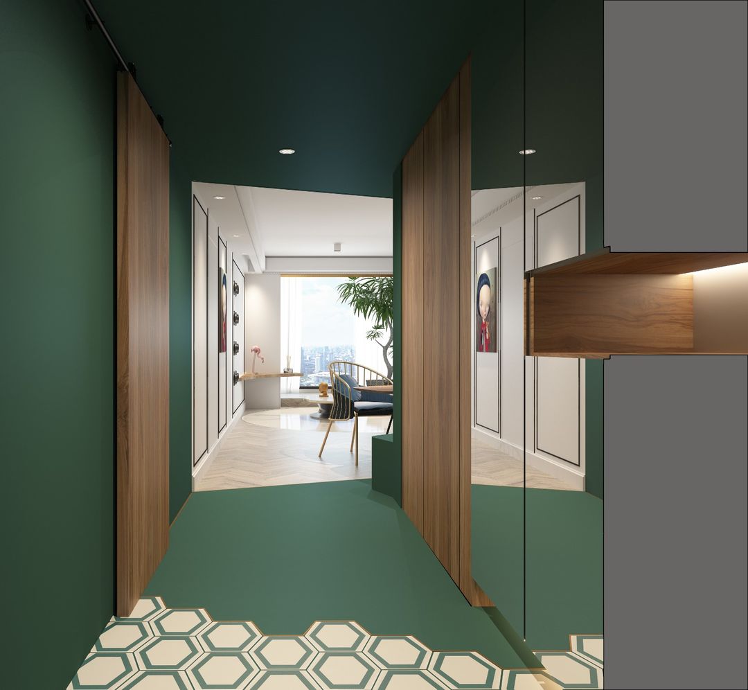 玄关处以大片绿色为色彩基调,镜面墙的设置将视觉空间拓展,两块原木板相对排列两端,既是设计上的对应烘托,也很好的将两个功能空间——厨房和卫生间分别隐藏起来。令人一进房间,即见到明亮的客厅,暂时将生活的繁琐抛之脑后。