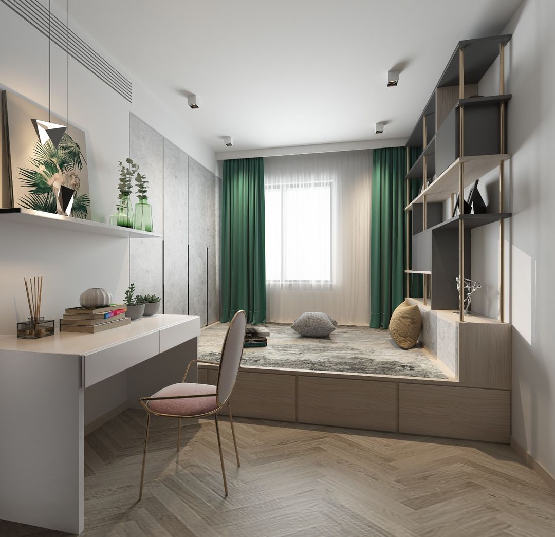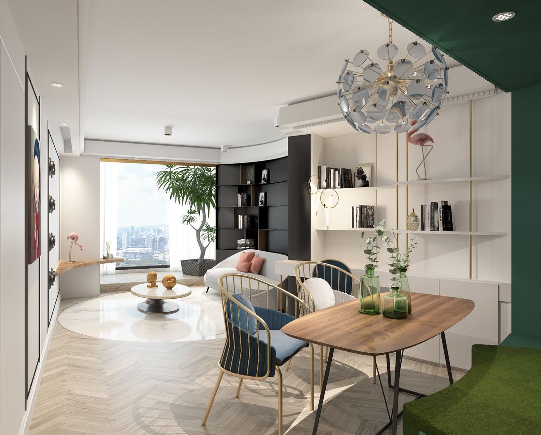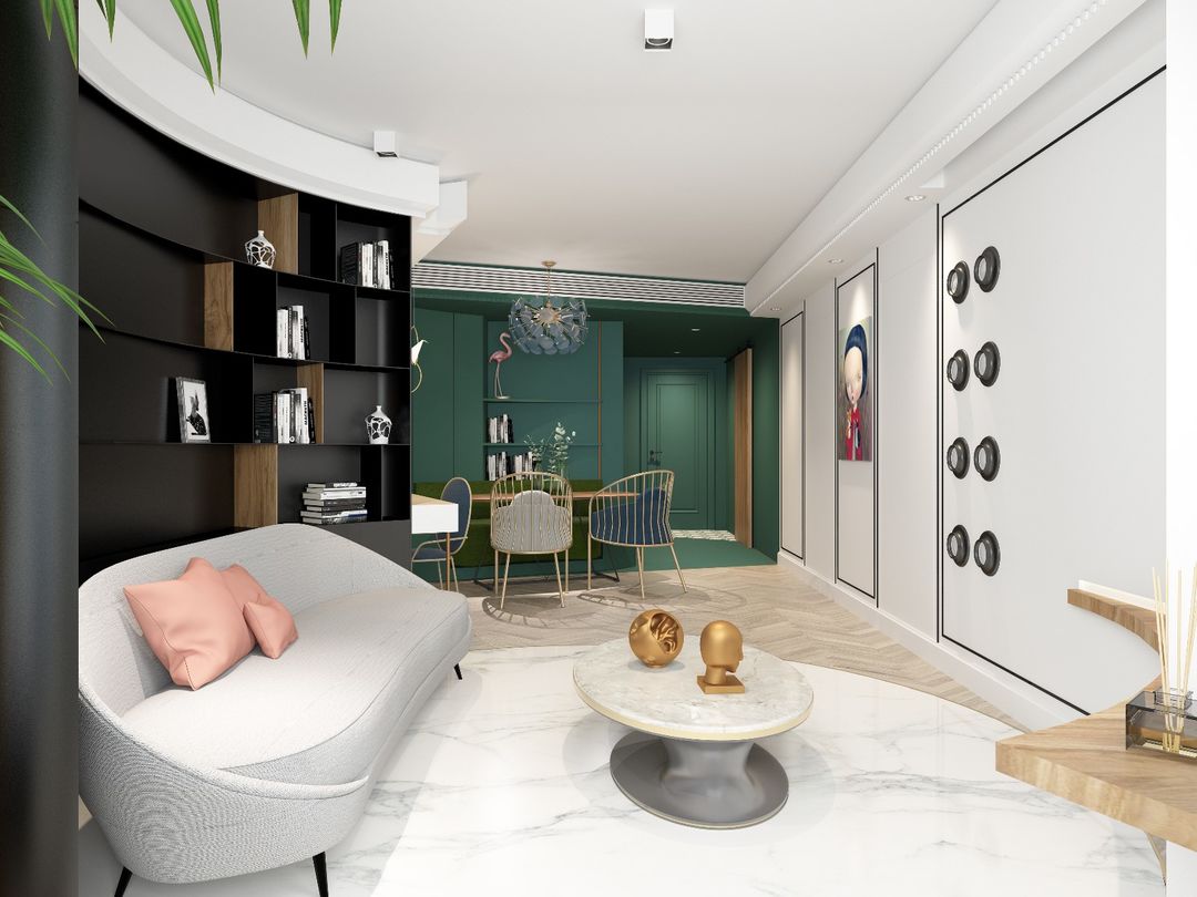 时尚简约风格装修,借助弧形的巧妙变化,满足对空间的特殊表现需求,将视觉引导至令人愉悦的位置。在白绿色为主导的客厅中,沙发背面的黑色组合柜极富质感,弧形设计呼应对面镶在墙角的弧形板台,将客厅圈定成一个圆形,为静物空间注入流动的韵律。