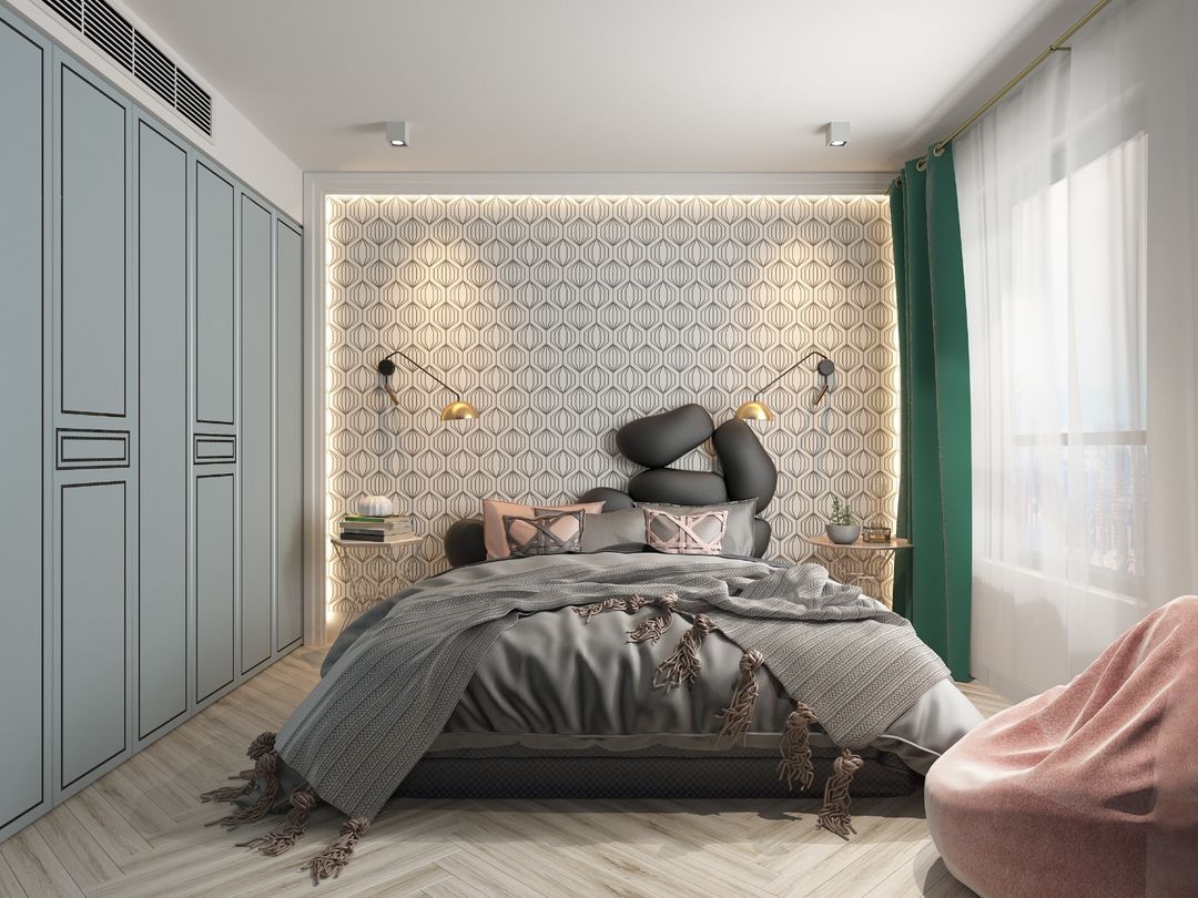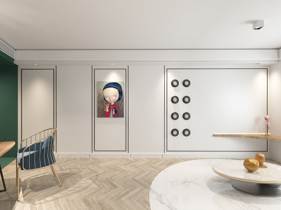 前言: 本案在70平米的空间中,安排了两室一厅一厨一卫外加一个阳台,空间功能齐全而无杂处一室的压抑,设计师利用弧形和隐形门的设计很好地规避了视觉上的窒碍感,再运用大面积明亮的白色和活泼的绿色,整个空间显得清新自然、宽敞大方。