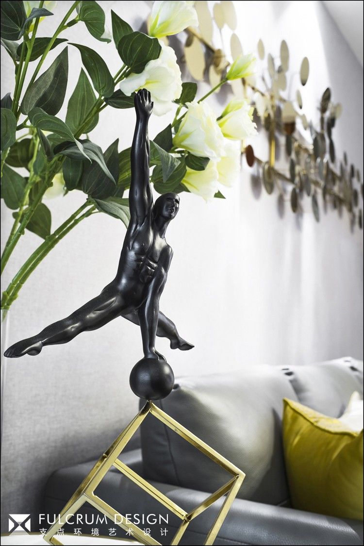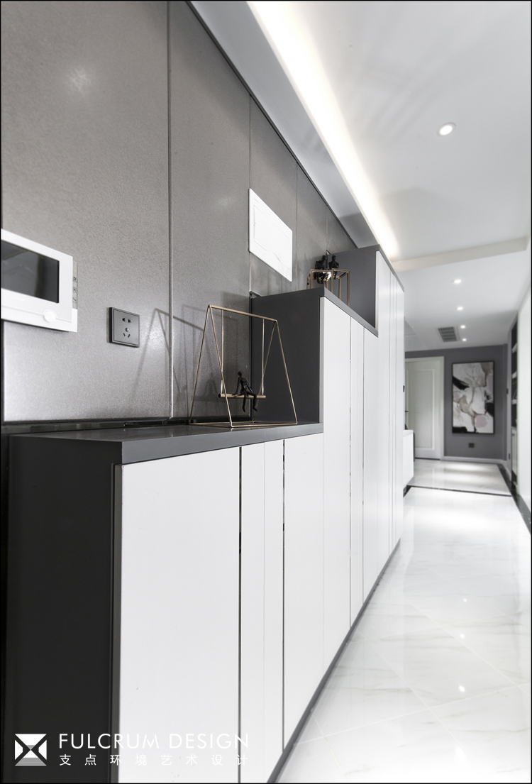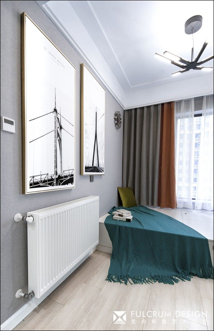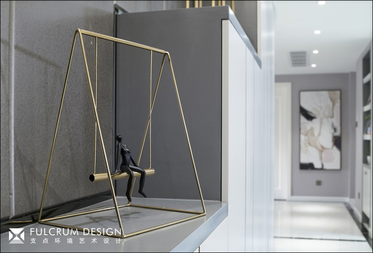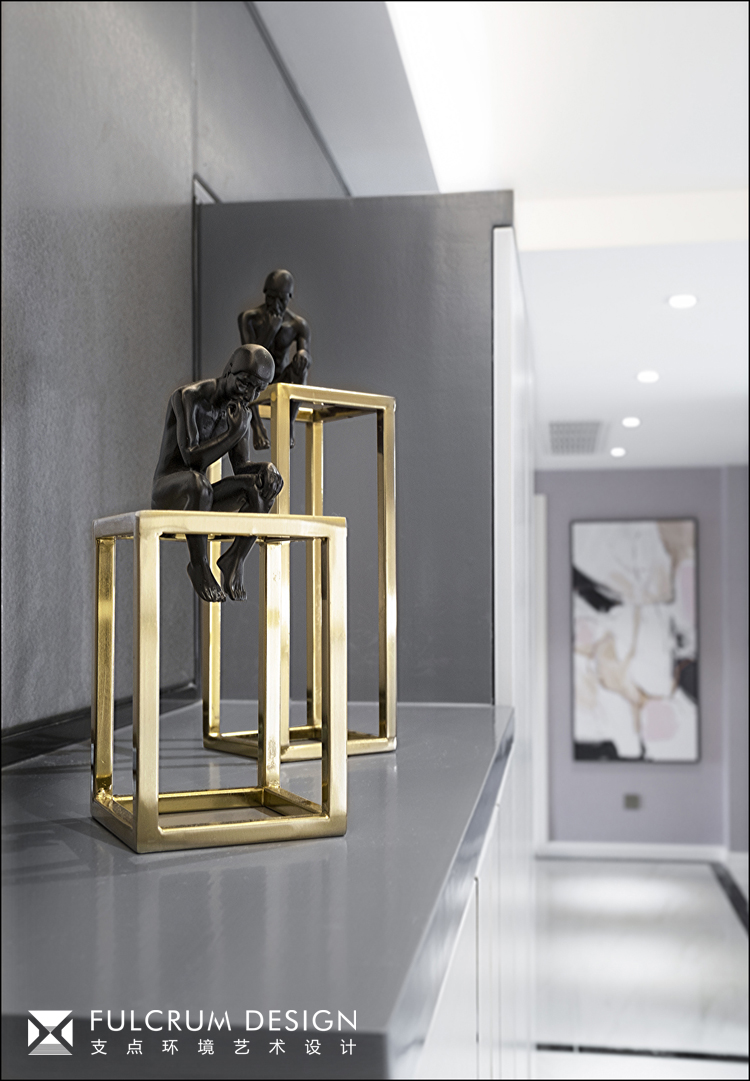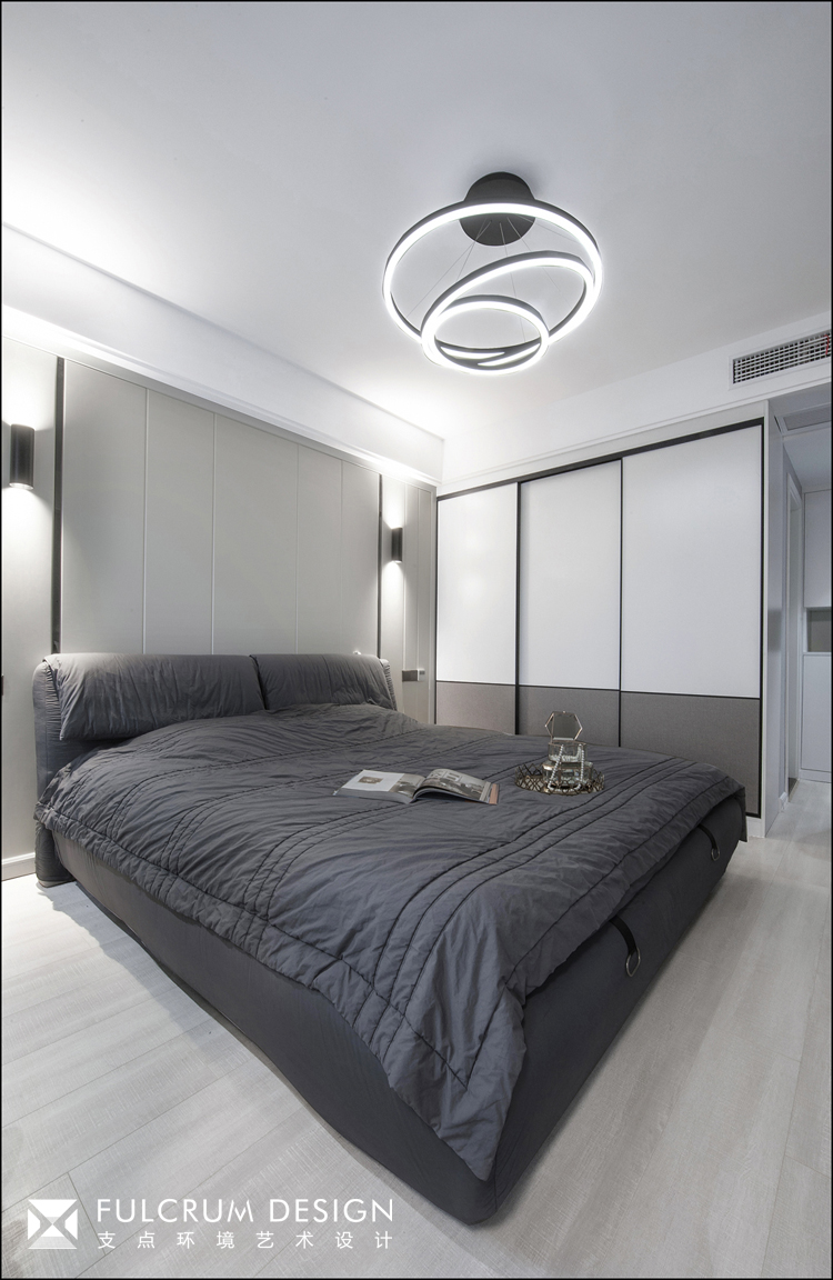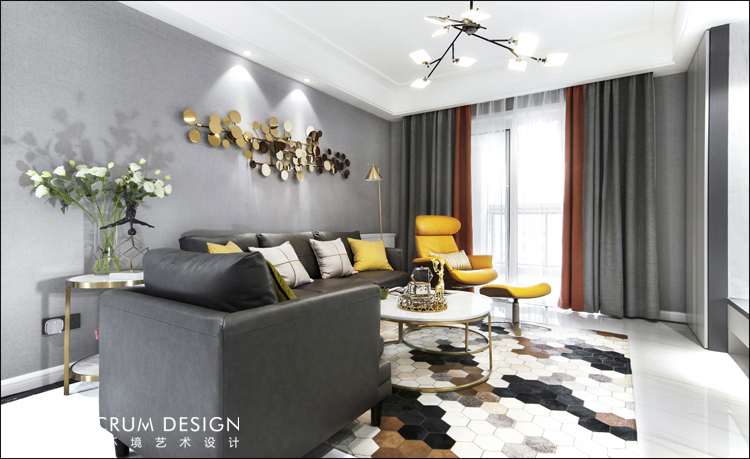 在色彩搭配上,本案以各种层次的灰色为主,点缀各种金属色和橘黄色。结合各个空间中点线面的运用勾勒出有序的铺排。材质上皮质的沙发支撑了主要空间的筋骨,布纹的墙布和厚实的布艺床带来了家的温和,将人从工作之余的紧张中抚慰回来。橘黄色的椅子点缀其中,形成焦点,让人精神一振。