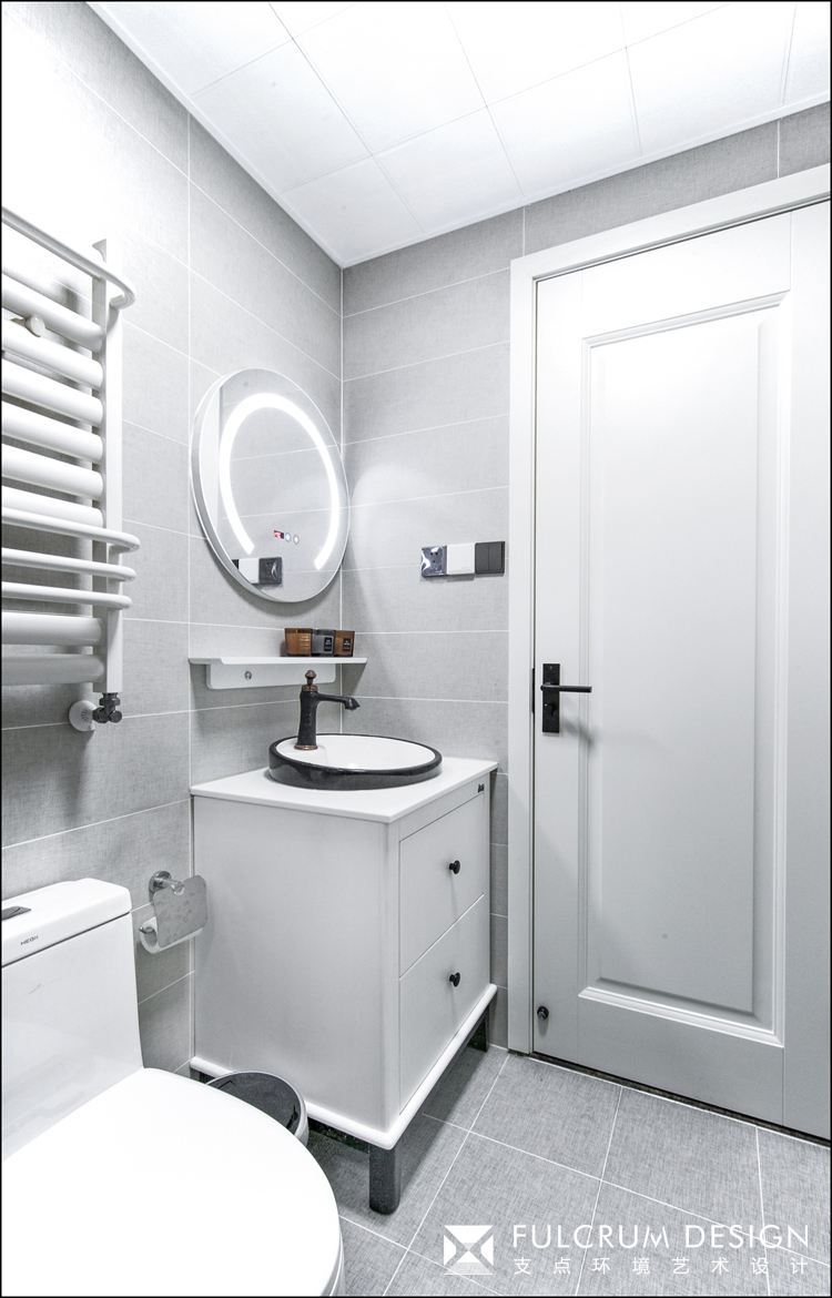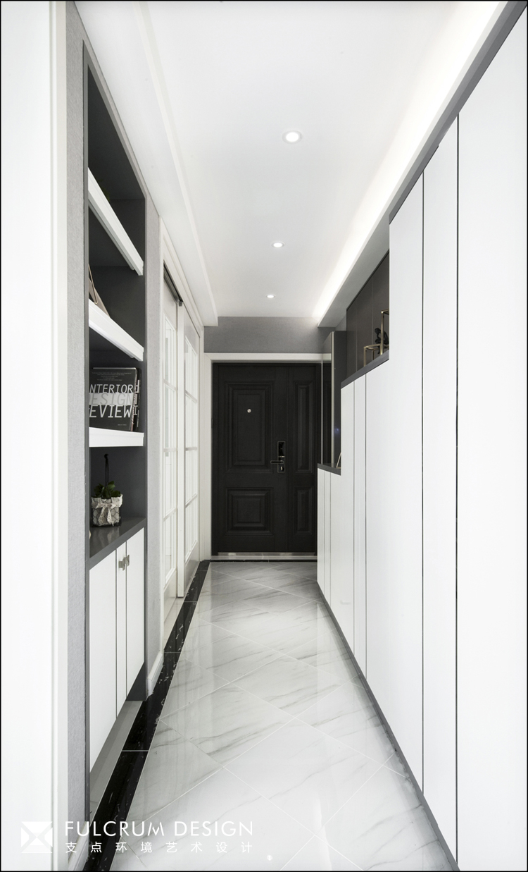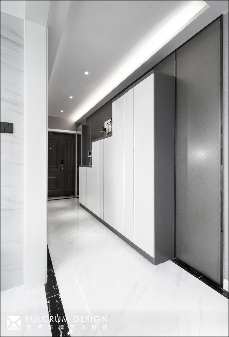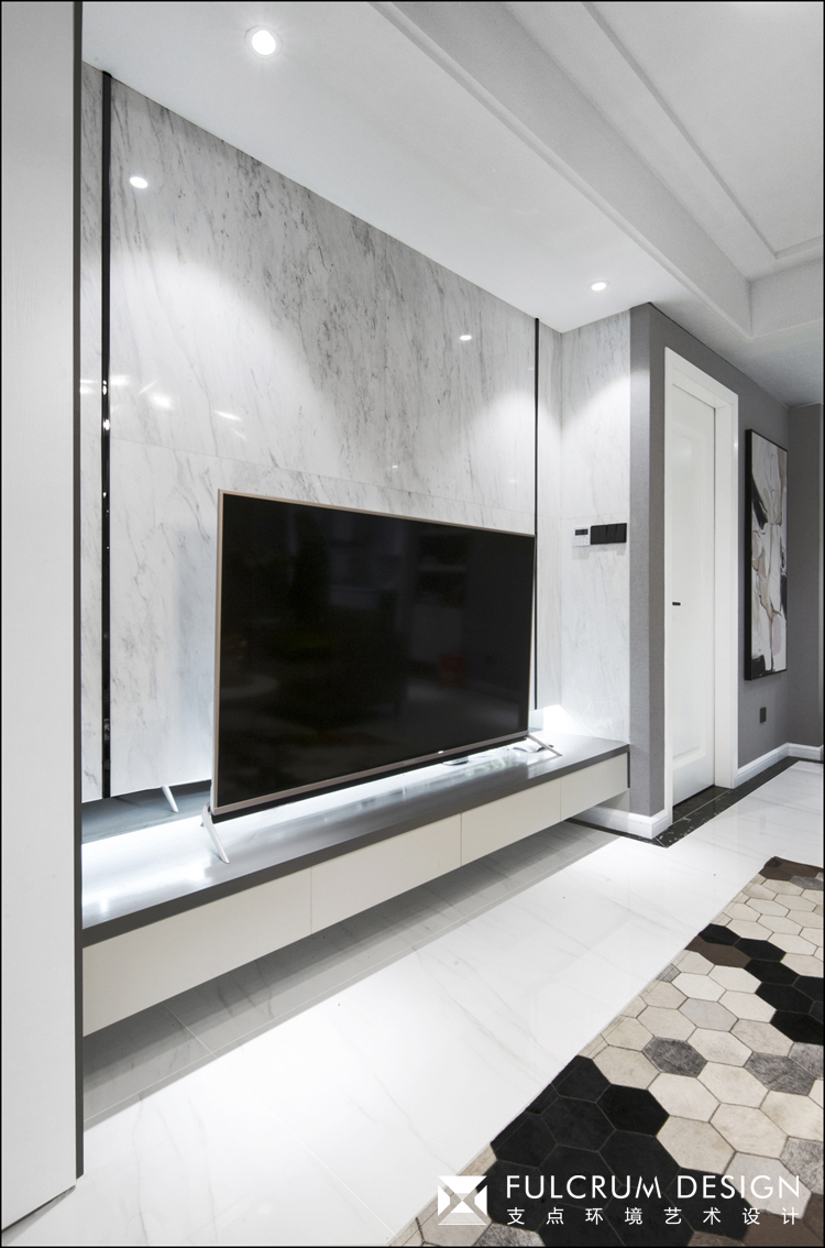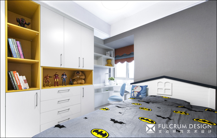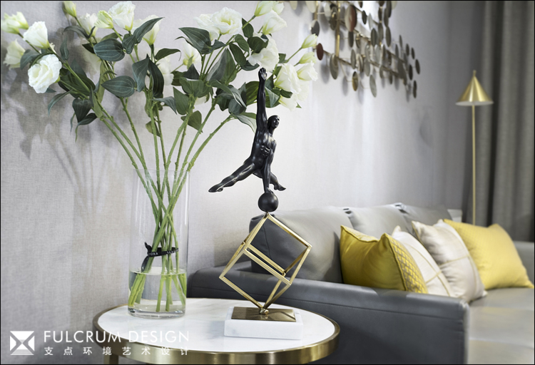 在色彩搭配上,本案以各种层次的灰色为主,点缀各种金属色和橘黄色。结合各个空间中点线面的运用勾勒出有序的铺排。材质上皮质的沙发支撑了主要空间的筋骨,布纹的墙布和厚实的布艺床带来了家的温和,将人从工作之余的紧张中抚慰回来。橘黄色的椅子点缀其中,形成焦点,让人精神一振。