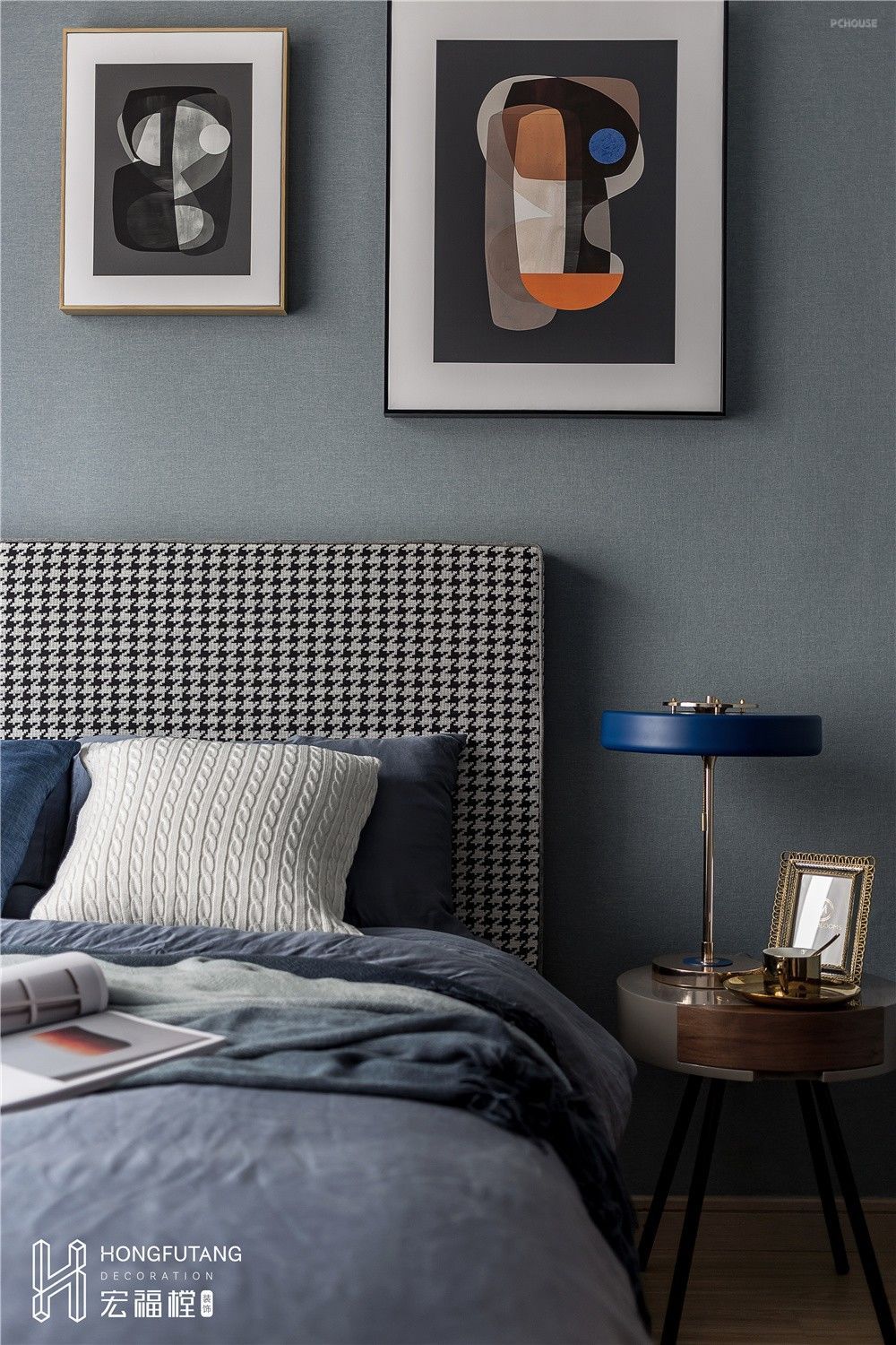 主卧延续整个空间的调性,在这里采用深灰蓝壁纸,可以与客厅风格统一,依靠原有的木色衣柜与门框,还能达到宁静、温暖的卧室氛围。主卧面积有限,将床体一侧靠飘窗,由此设计师特此选择大小不一的两幅画挂置床头墙面,平衡墙面的重心,使得空间更加灵动。