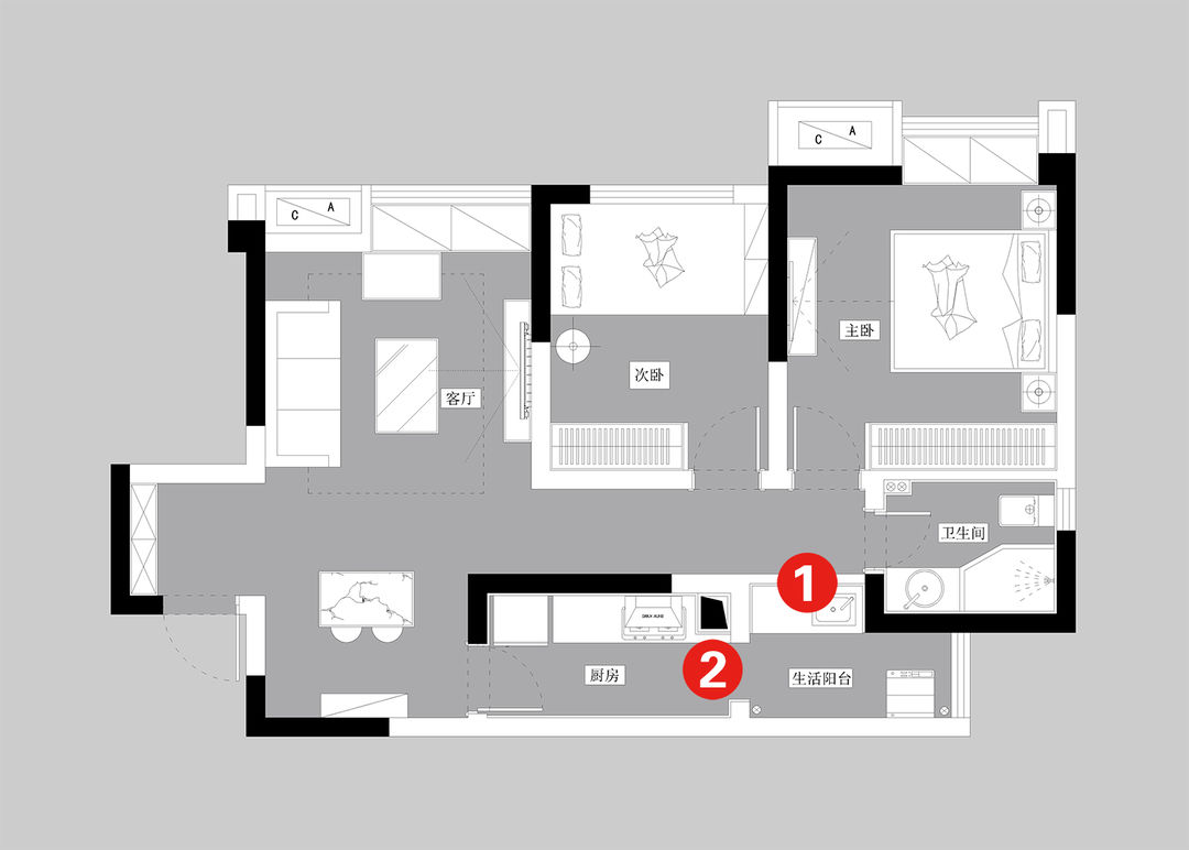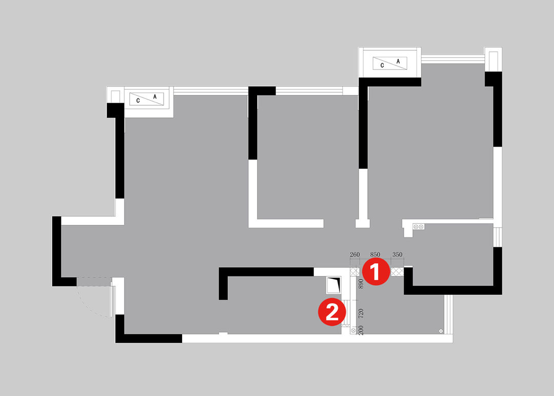 1、将原来850*2110的生活阳台门封墙,改造成生活阳台洗漱池的位置。