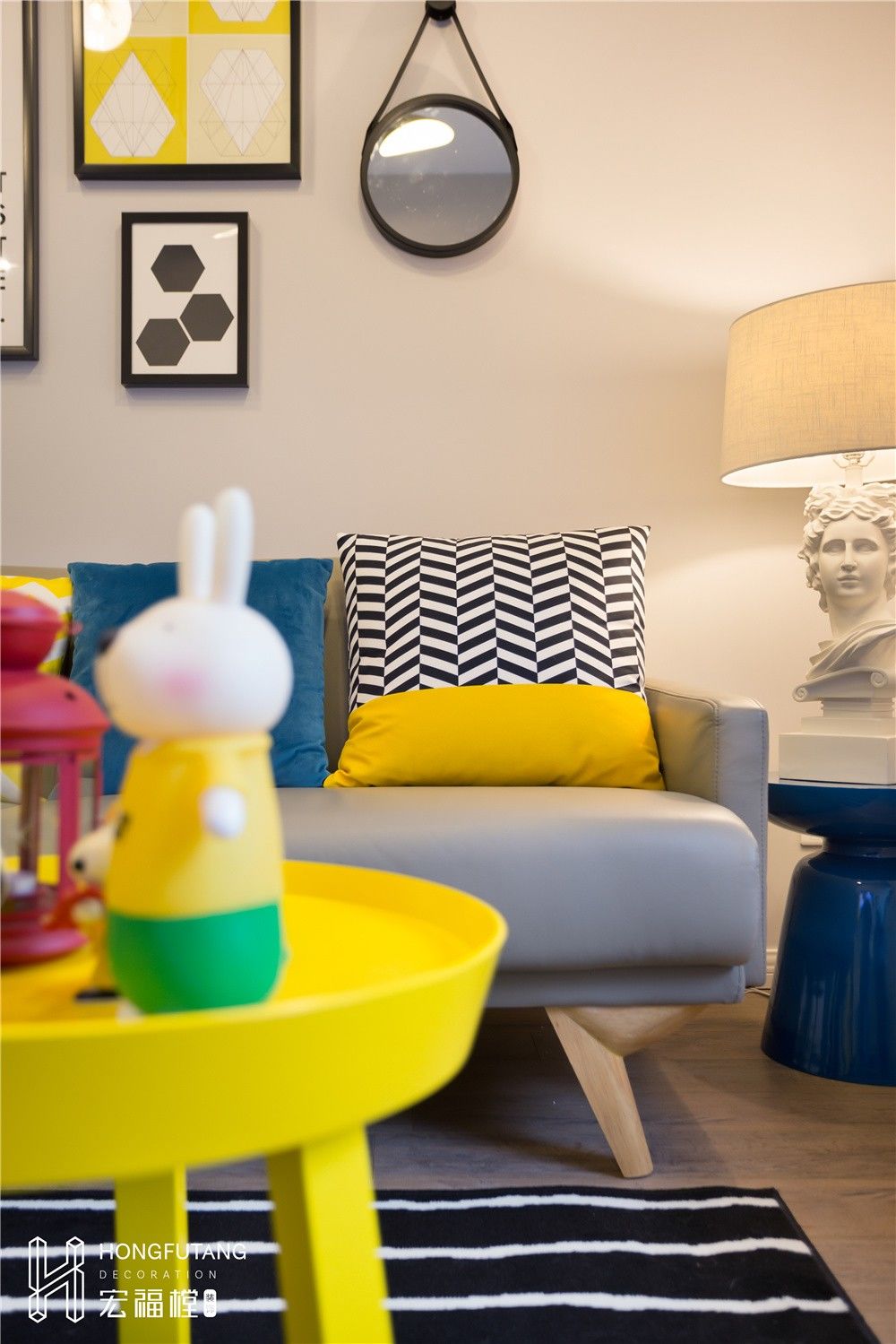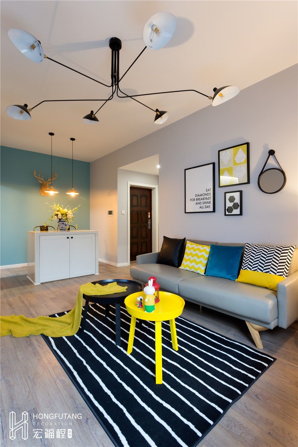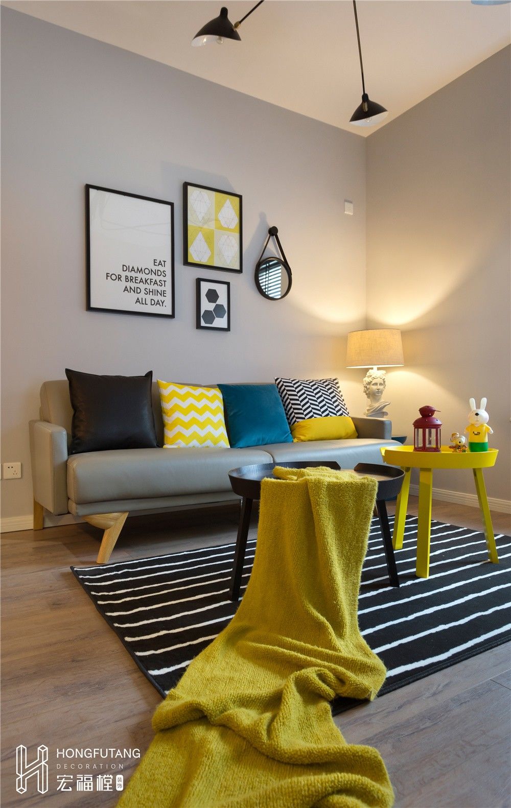 客厅主色调一灰色为主,搭配原木色地板以及淡黄色暖光,营造温馨舒适的居家气氛,打造出客厅一家人休息聊天的环境。用黄色软装中和主色调的沉闷无趣,加上随处可见的小摆件,为客厅空间增添元气活力。