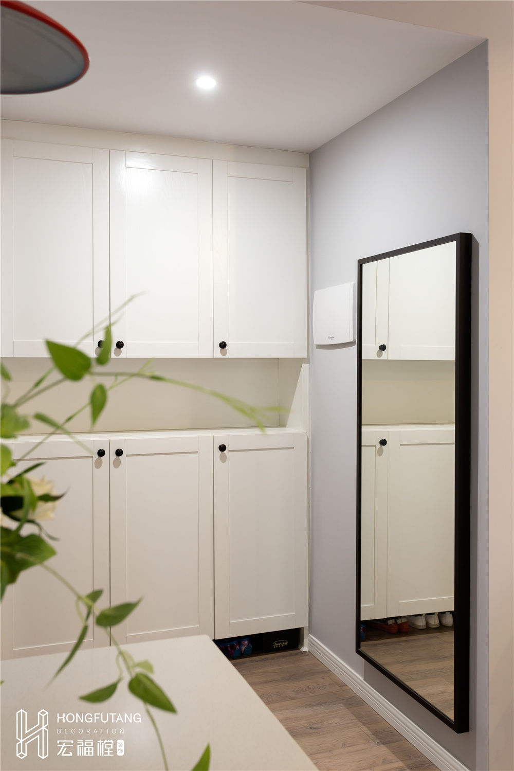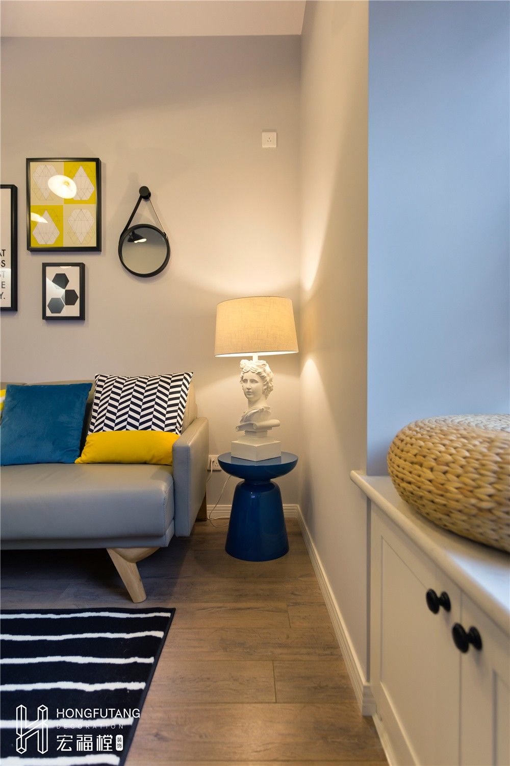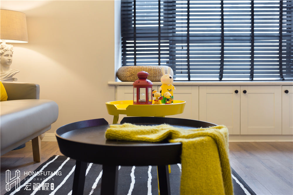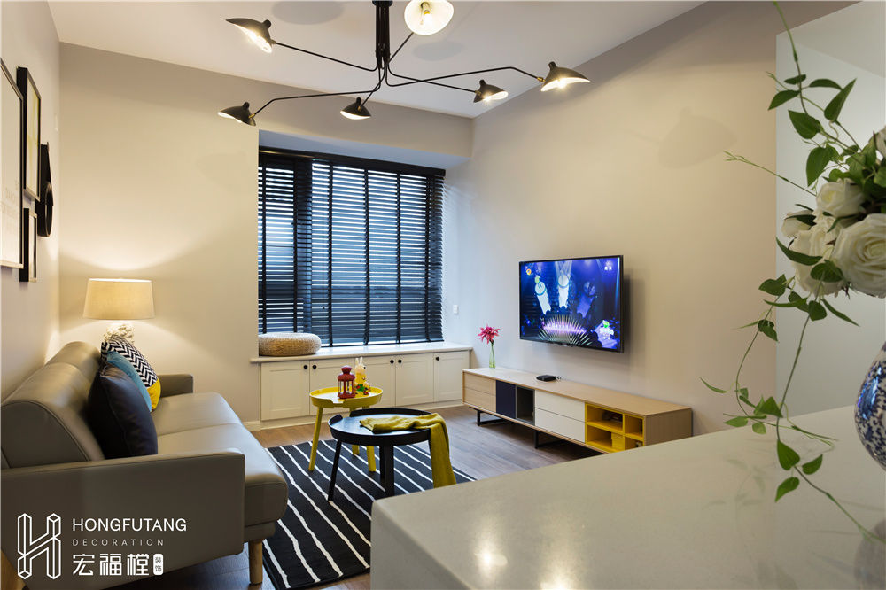 考虑到客厅空间有限,设计师整个房间布置的物品有限,选择可容纳常驻人口的单组沙发,合理利用空间的同时也可满足基本的生活需求;客厅内置飘窗,设计师采用百叶帘营造北欧风的极简特征,飘窗处设置木质储物柜,利用有限空间,扩大生活储物功能。