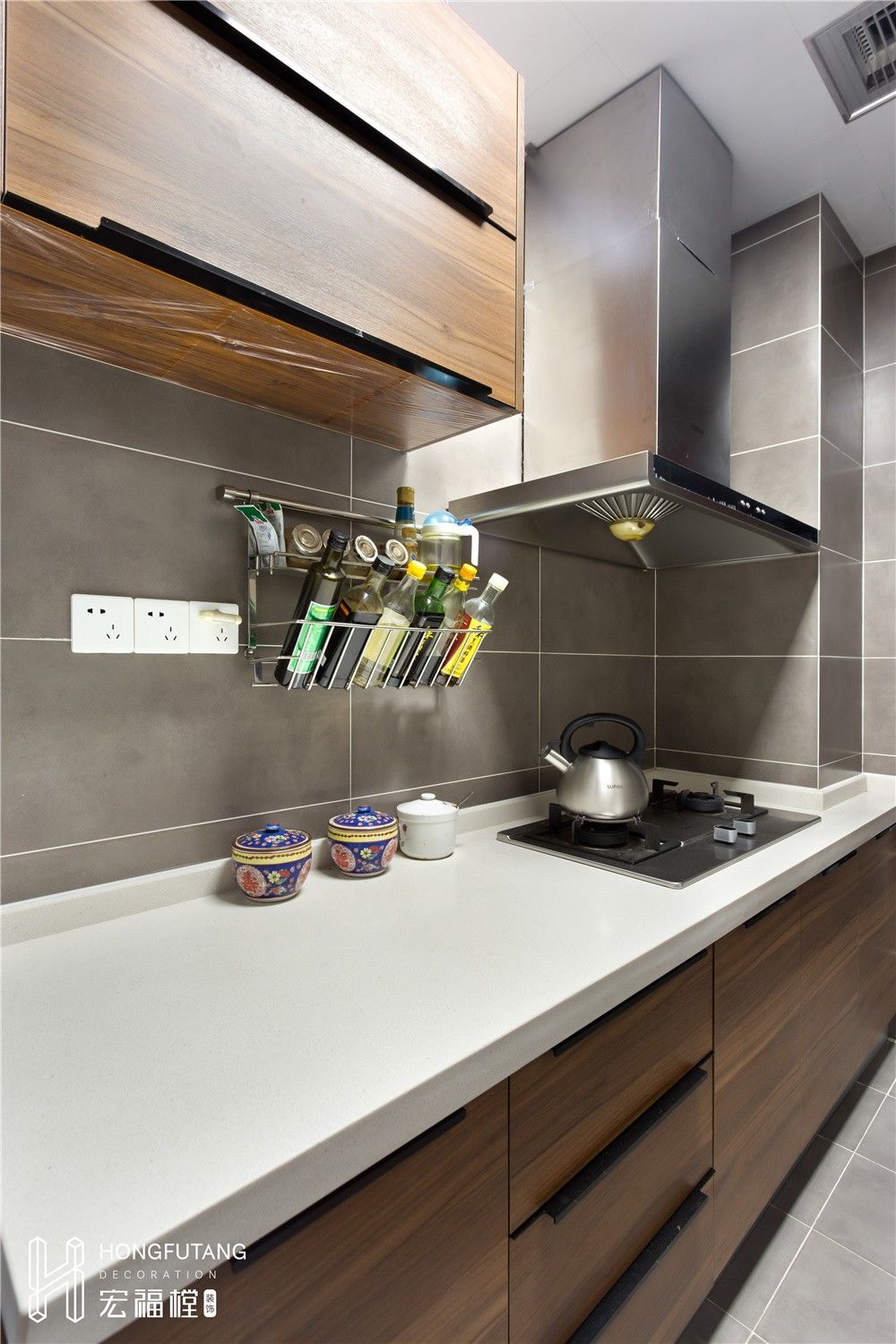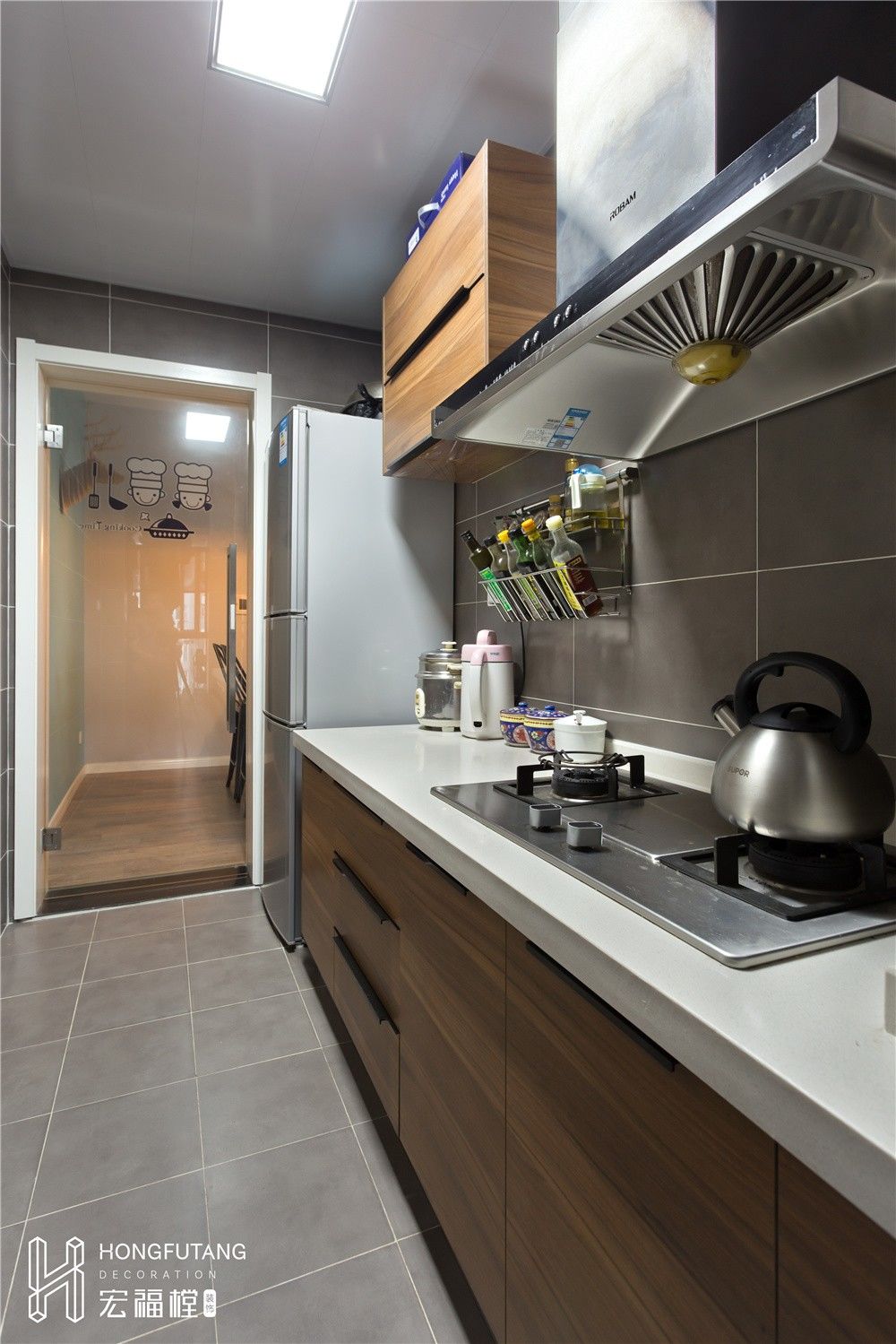 设计师根据厨房原本户型,设计一字型橱柜,利用棕色搭配白色大理石台面,使得狭小的空间更有层次感和递进感;厨房原本采光窗户所在墙面拆除,做成由厨房通往生活阳台的门,增加厨房通风采光效果,扩大了厨房的使用面积;原户型中从客厅通往生活阳台的门改造成洗手池,使得生活阳台的户型更为方正,也为生活阳台的使用提供了更宽阔的空间。