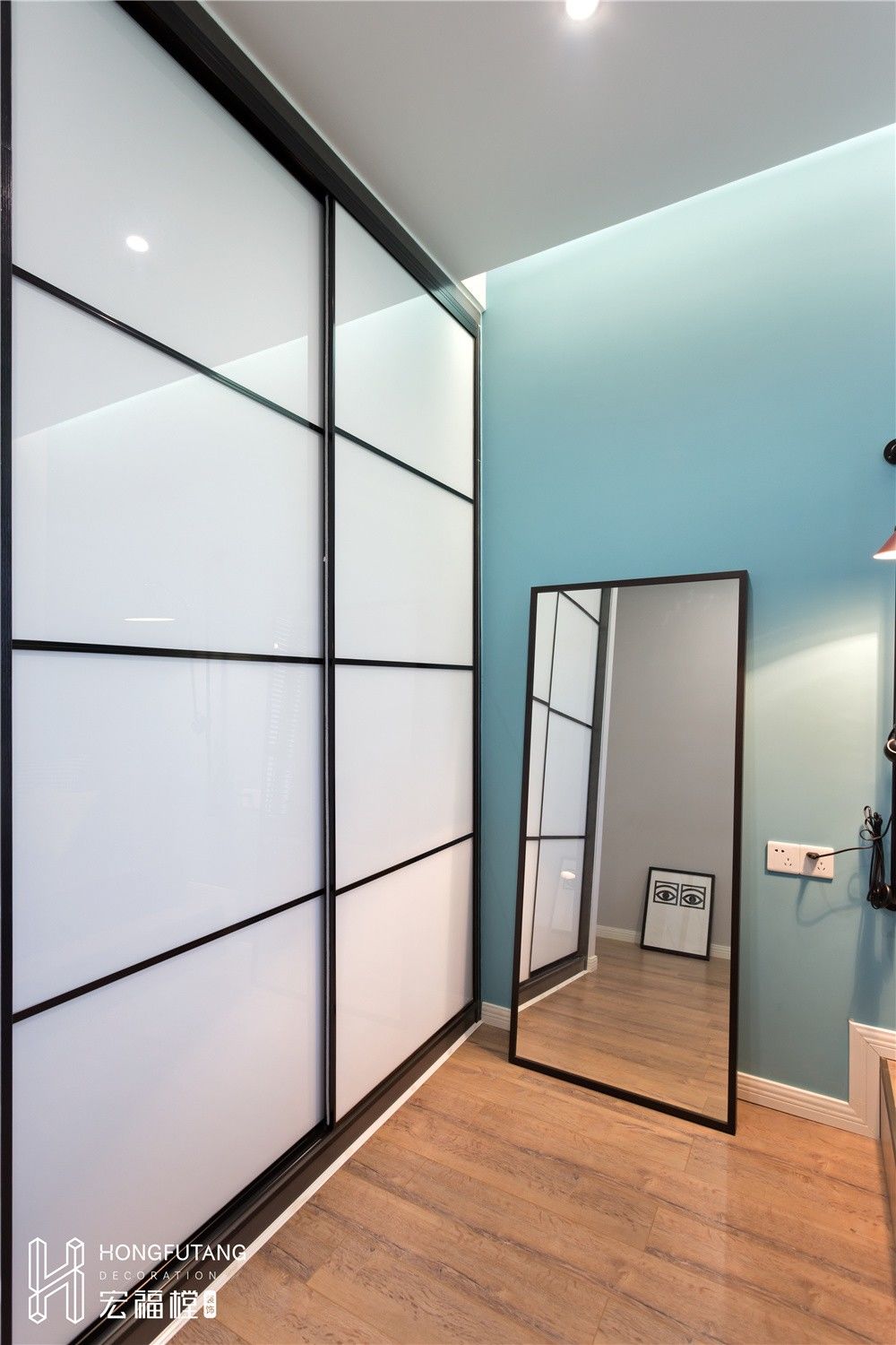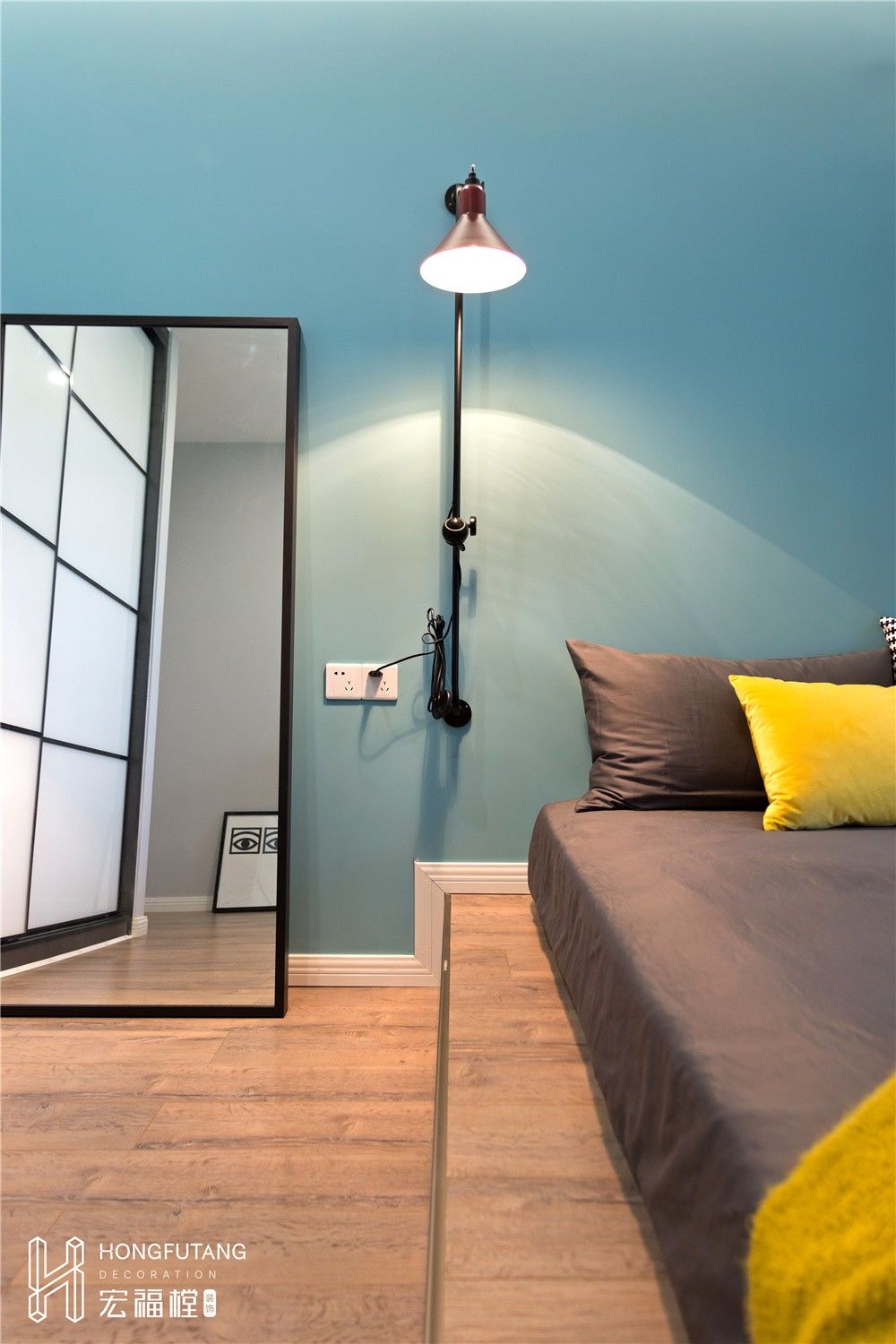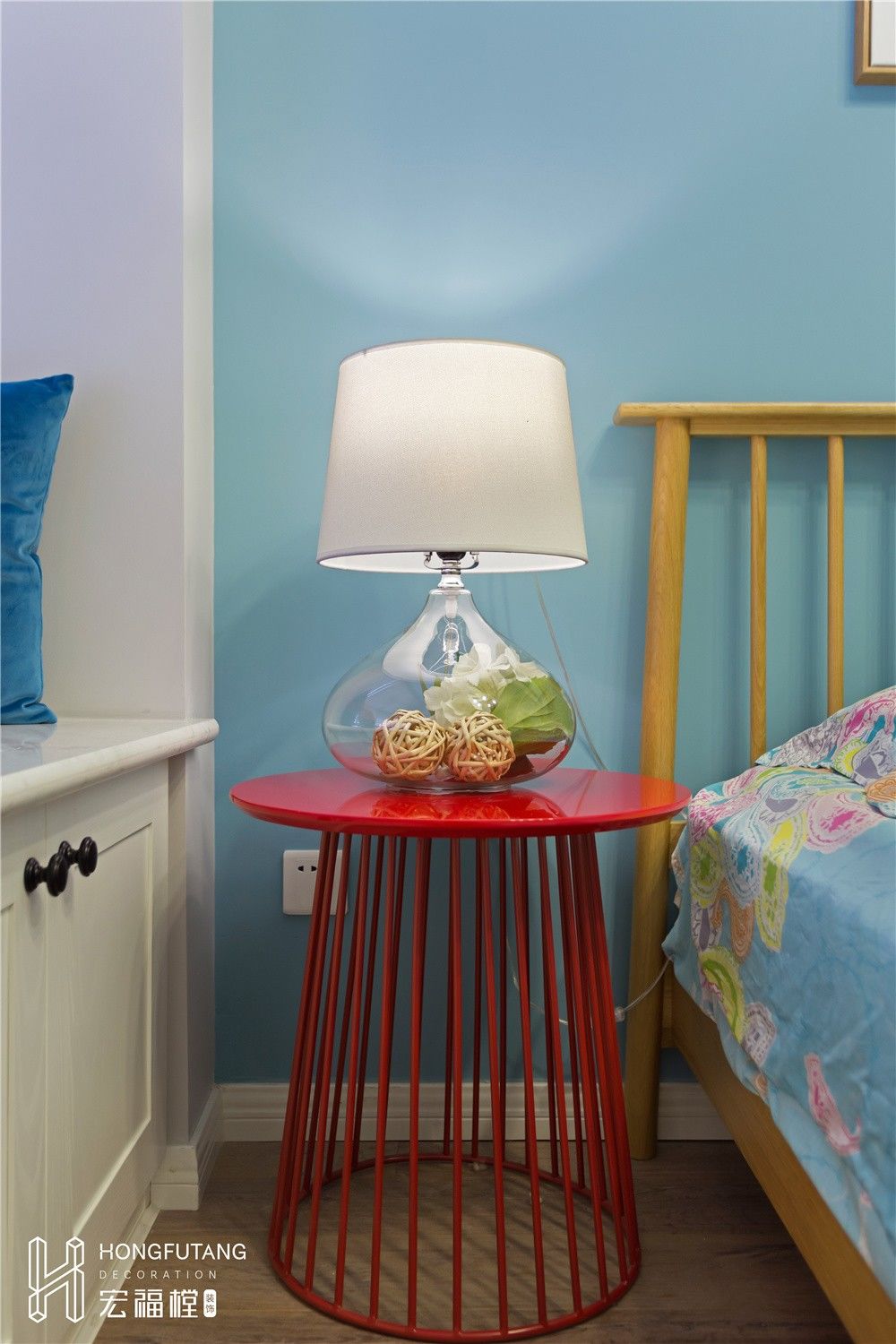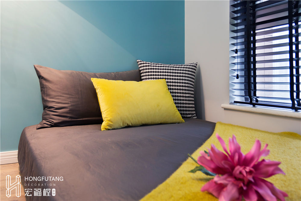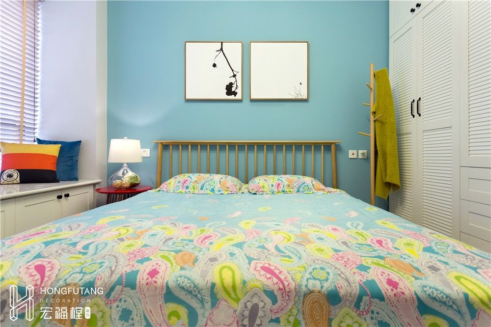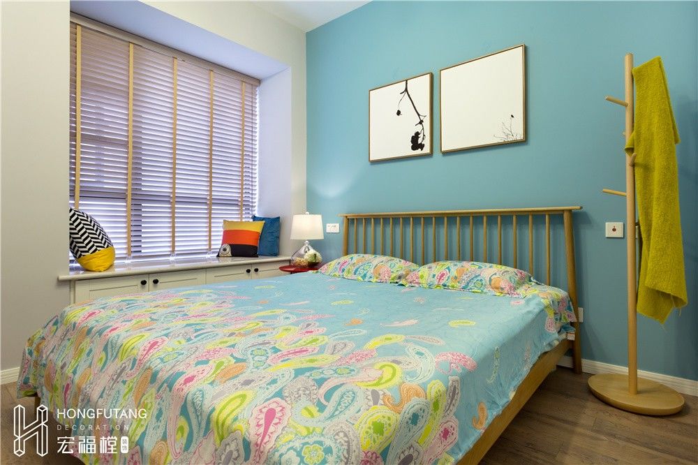 主卧延续客厅风格,天蓝色壁纸安静舒适,采用百叶帘,减少布艺窗帘带来的拥簇感,利用飘窗增加储物空间,选择原木色床,利用木质感增添房间的温暖,利用亮色软装,使得空间的软装搭配整体更加精致,没有采用繁重的床头柜,红色的置物小桌,成了室内不能忽视的一抹色彩。