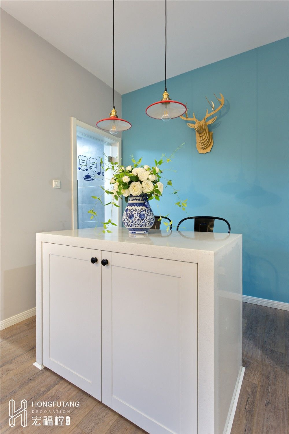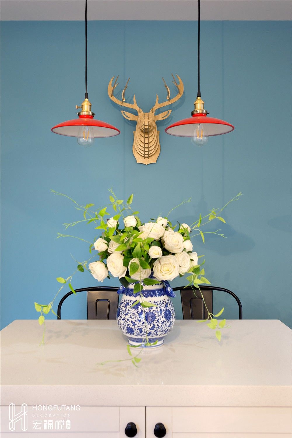 餐厅的背景选择天蓝色,是代表初始的颜色,是生物在最年轻时的代表,在心理暗示来说,属于“安抚色”,是令人安静并放松的颜色;采用北欧风格常见的鹿角,作为装饰;精心选择的两盏橙色的灯具,既带有复古特色,也暗示像父母那样双双对对,恩爱如初。忙碌一天之余,在餐厅享用美味的食物,是一件很轻松愉悦的事情。