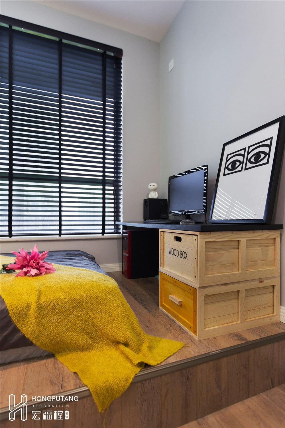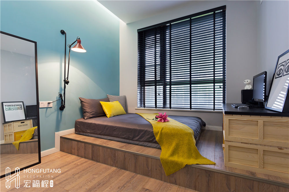 榻榻米的设计成床和电脑桌一体,,尽可能减少家具的多余堆放,节约了有限的空间;利用明黄与原色系的地板相衬托,飘逸着一种轻盈慵懒的华丽。