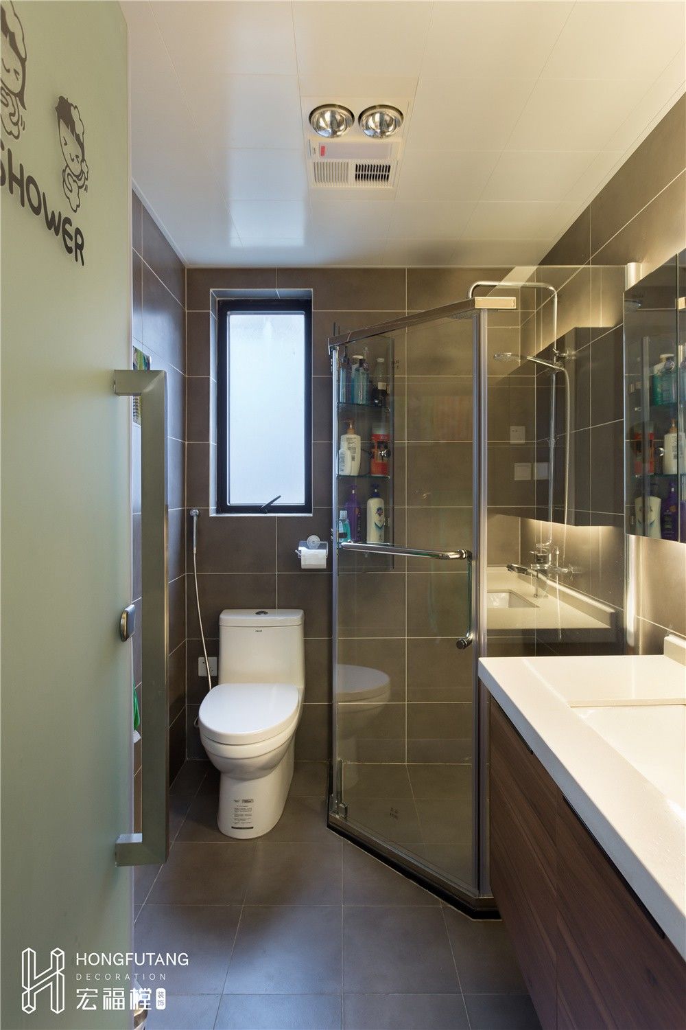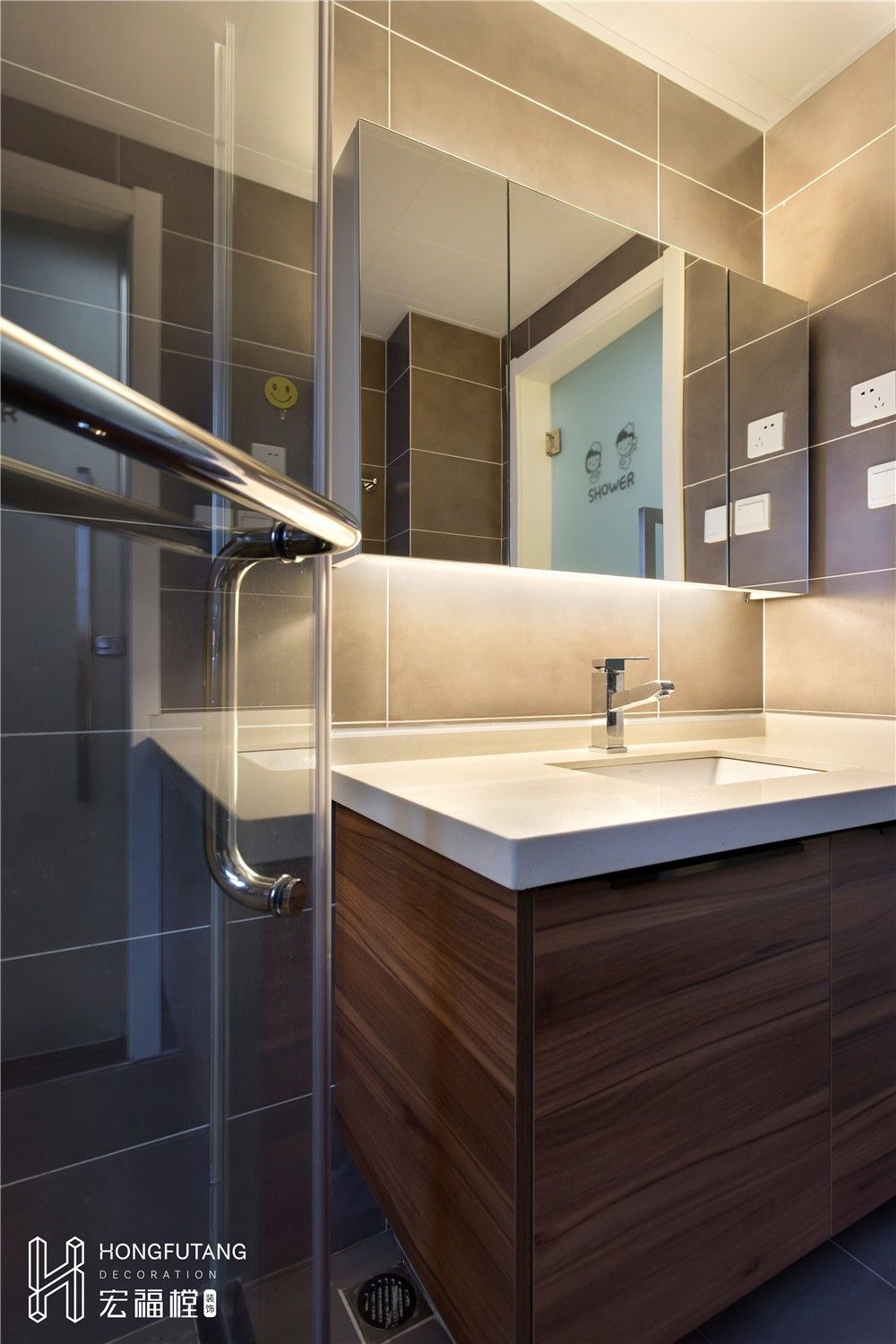 卫生间与厨房风格一致,青灰墙砖显得空间清晰明亮,无边化妆镜使得空间感更强;淋浴房的设计,巧妙运用镜面原理,增大了卫浴间的空间视感,同时,将淋浴范围清晰地划分出来,形成相对独立的洗浴空间,提高了卫浴间的使用效率。
