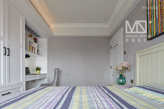 白色系的运用,让整个房间看上去干净整洁。实际上这样明亮大方的视觉效果更取决于整体空间的收纳规划——一整面的嵌入式柜体设计+定制的专属学习桌,将房间整洁度提升了一个层次。