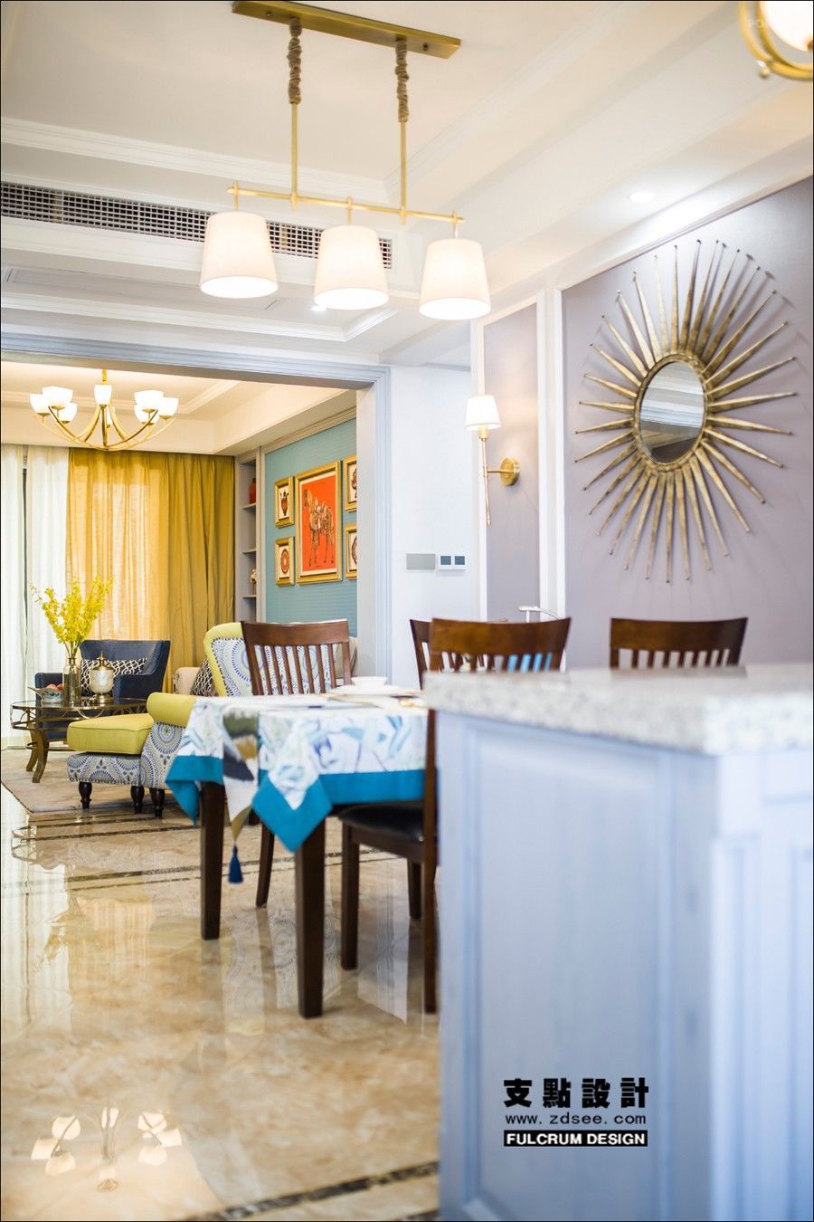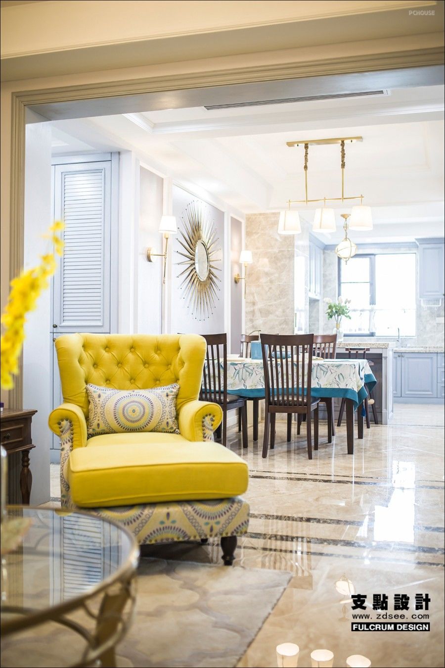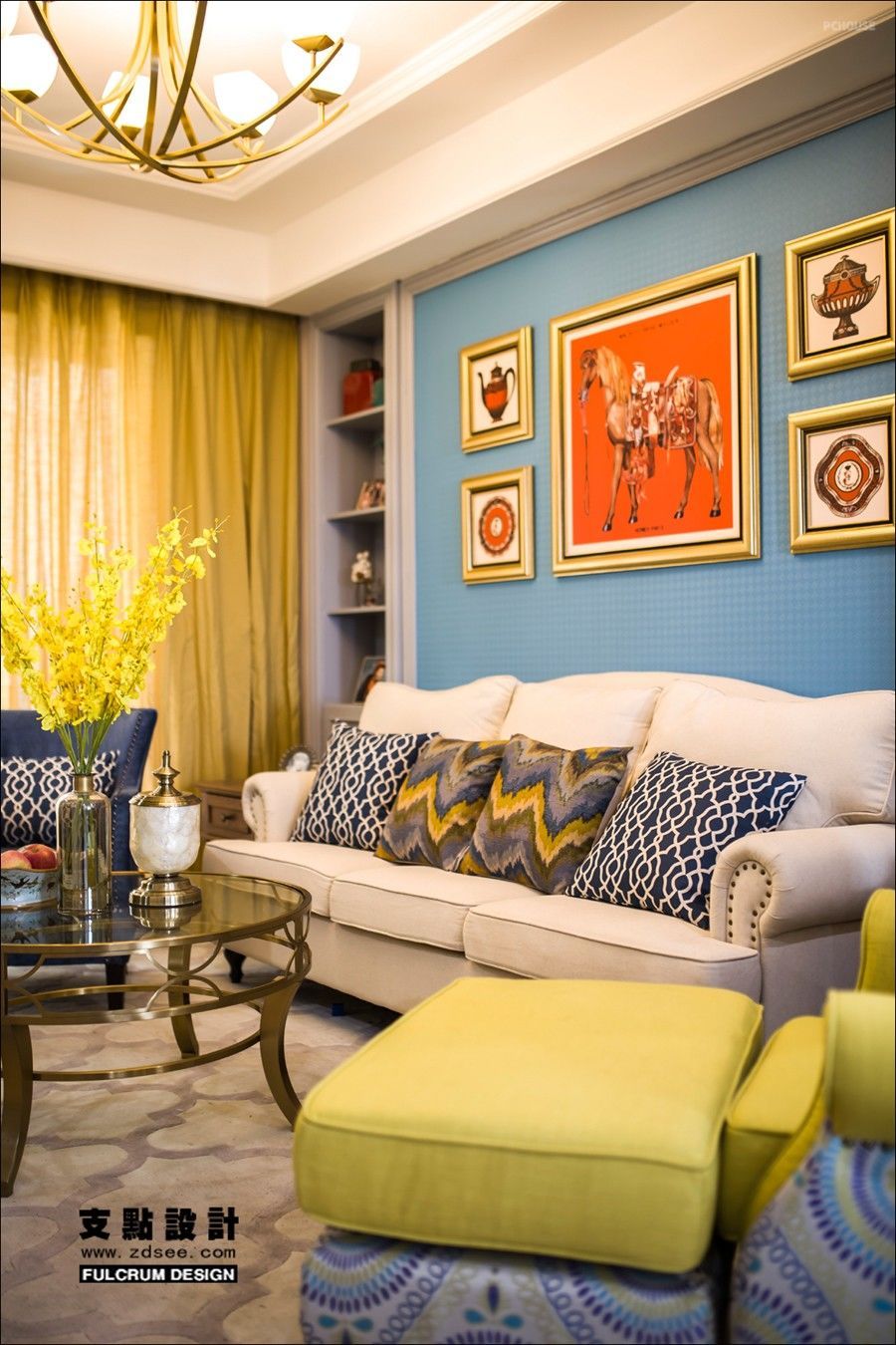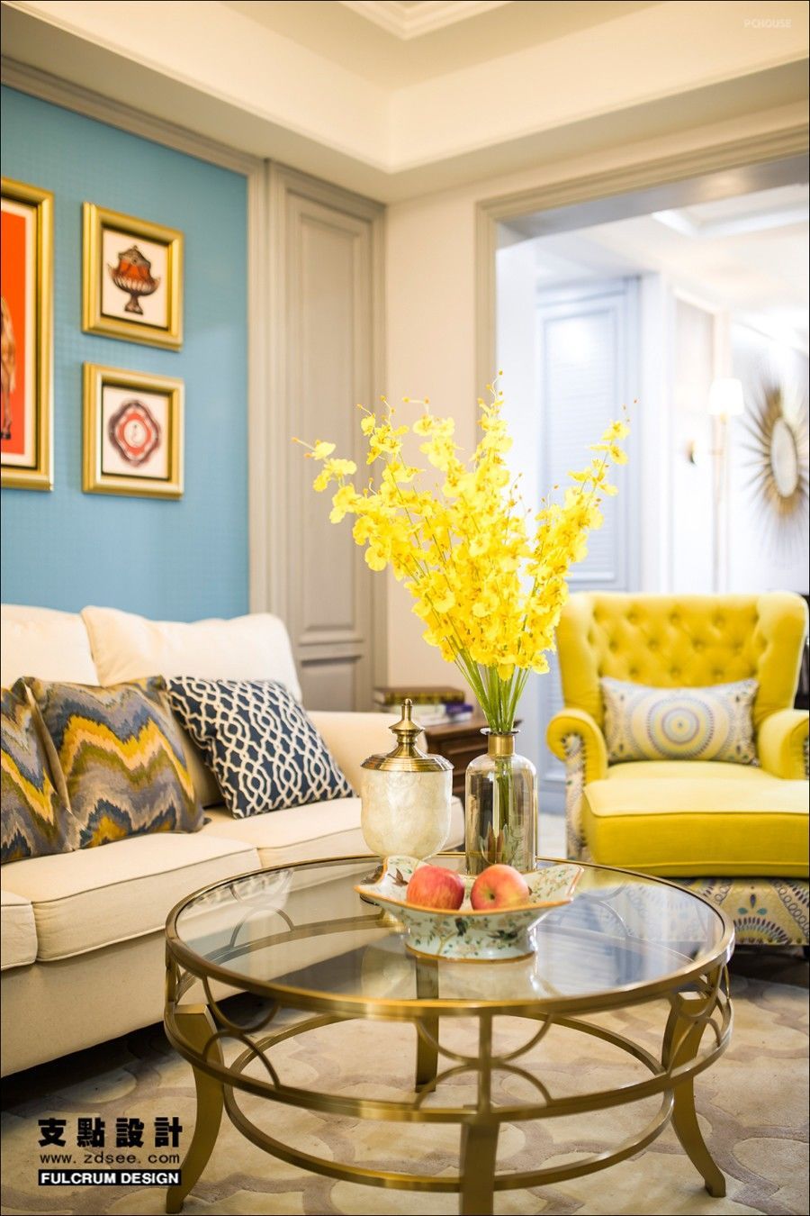 这套案例之中,浓烈而不张扬的蓝色面温暖而温馨,又有着一些单纯幸福的美感。黄色的单人沙发鲜艳明亮,几何纹理穿插其中,仿若置身花田。米色三人沙发包容承载、展现出了不同的层次,都是优雅轻松的格调。轻巧通透的铜艺茶几让空间更为活泼,彰显生活的激情。