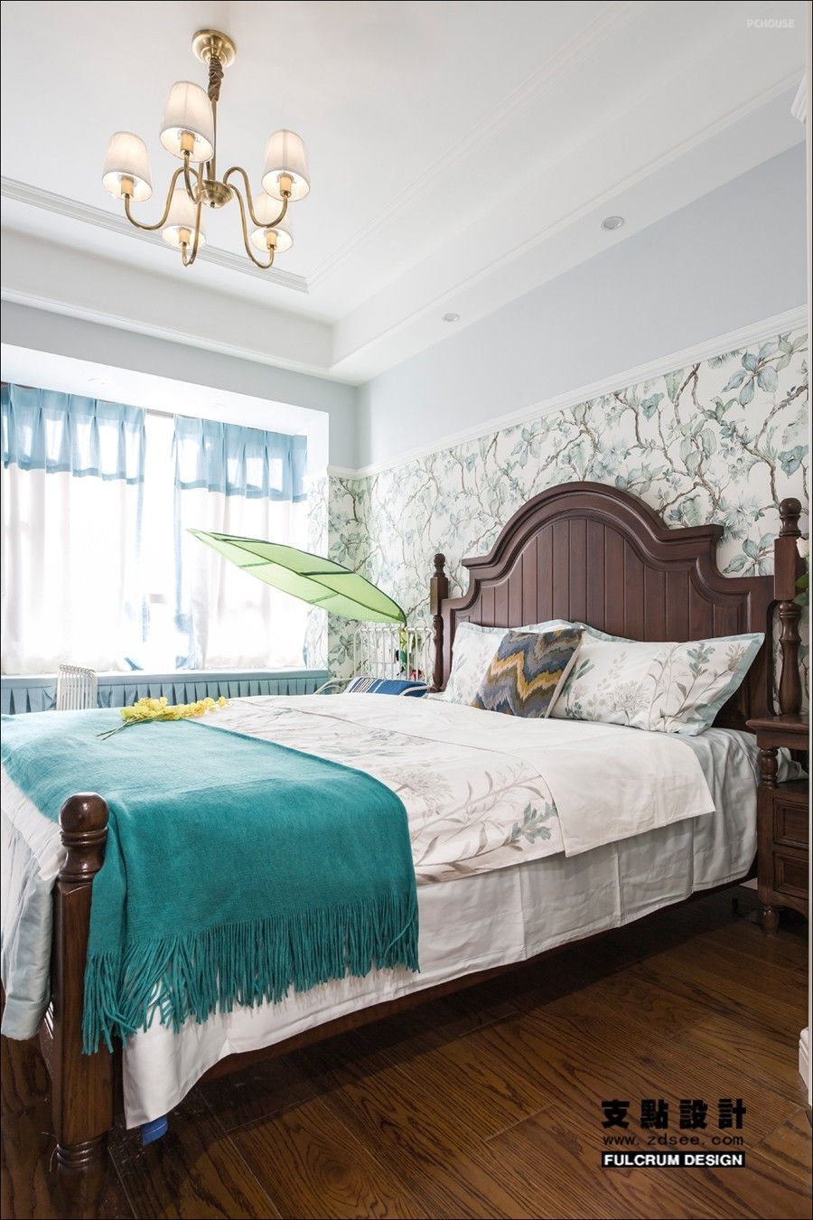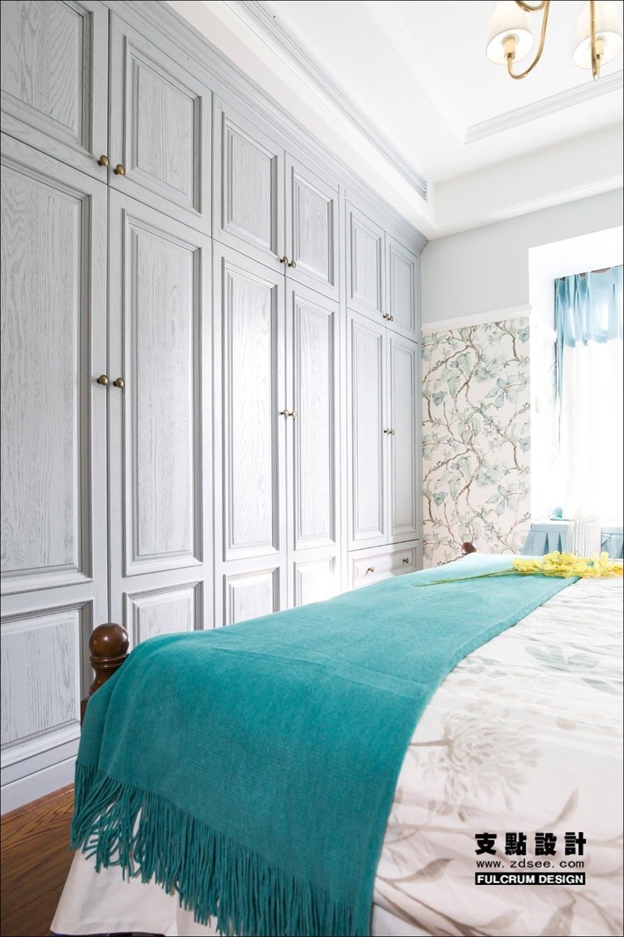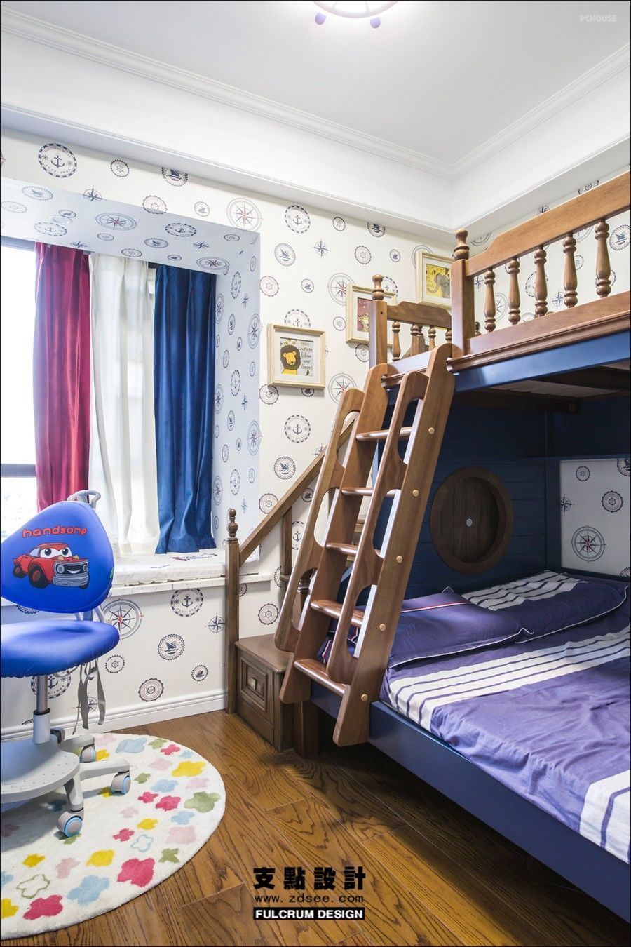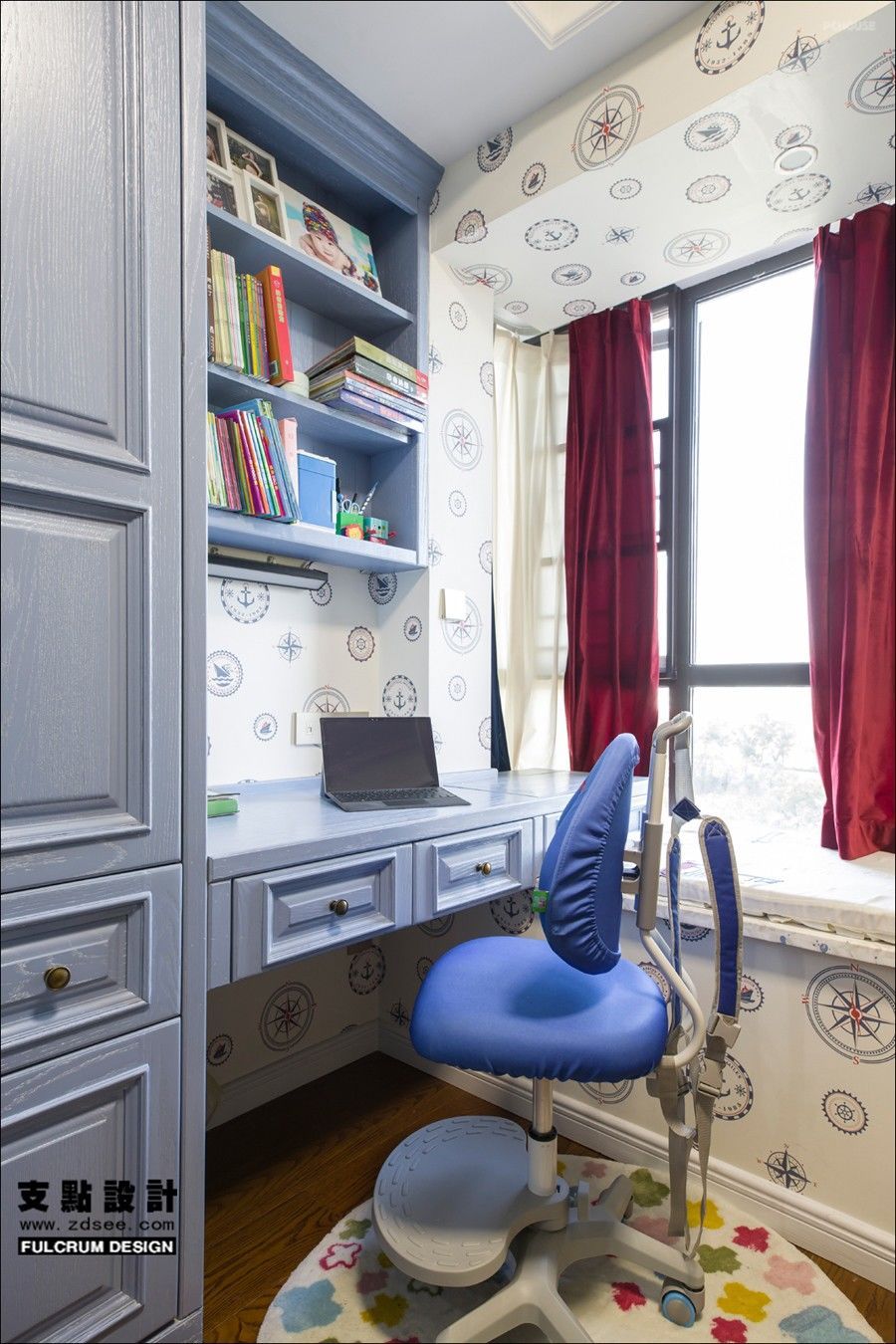 主卧墙面精致灵动的繁花图案纹样为空间带入丰沛的趣味性。在蓝色饰品对比映衬下,自然而鲜活。丰盈的层次中,温暖的质感释放开来。而蓝与红的组合我们把它运用于小男孩的房间之中,所产生出的奇妙体验也是个性十足。以温润的实木家具做背景,加入红色装饰,冷与暖相互碰撞,正如男孩子的敏锐和阳光。