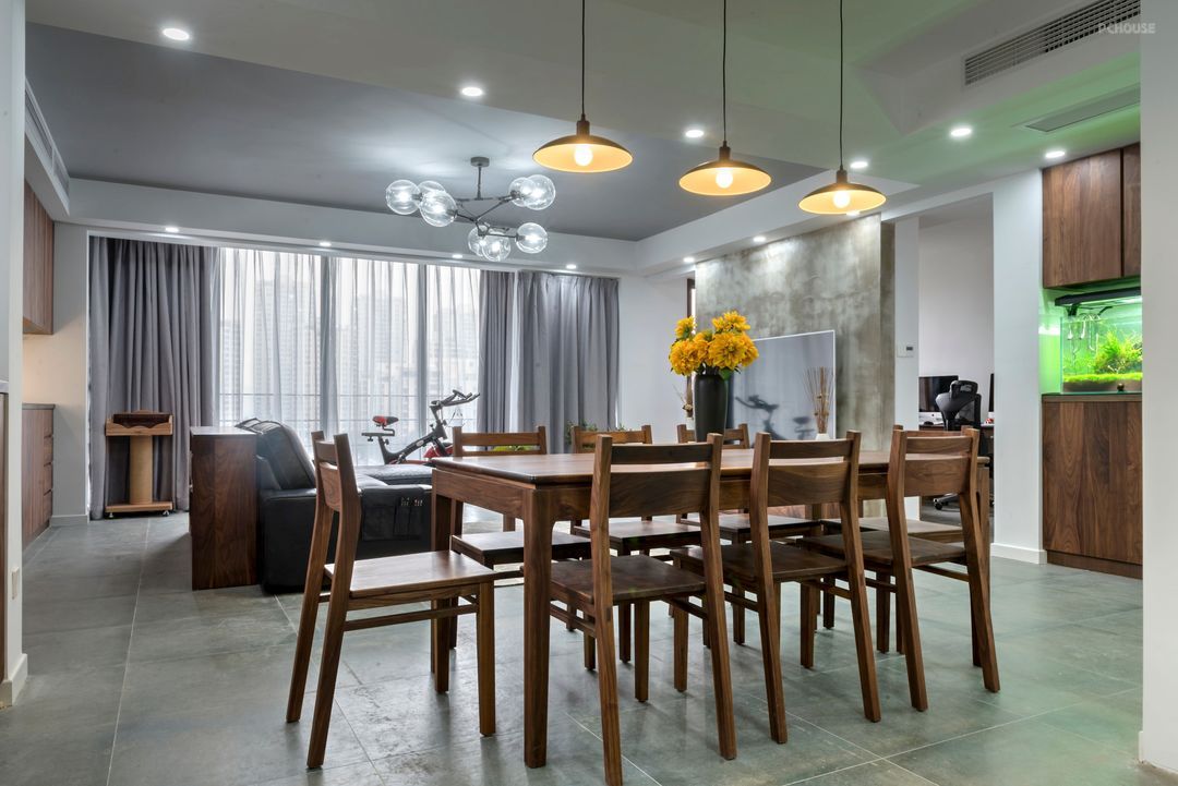简单的不能再简单,客厅餐厅厨房,都是简单的没有过多的装饰,但是电器收纳功能一样不少。家具柜门都是纯黑胡桃原木定制,喜欢这种木材的自然色泽,加上手工打磨的无可取代的质感和细腻却大气的自然木纹,确实是板材无法替代的舒适感