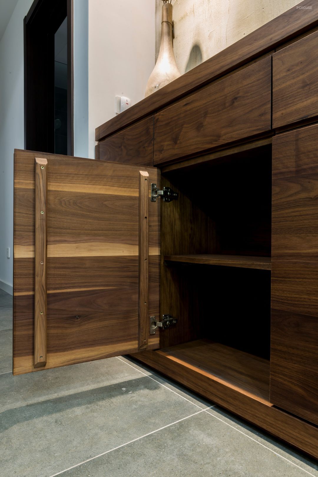 虽然简单,但是不缺收纳空间,沙发背后其实还有一个黑胡桃做的陈列柜,有很多的隔层可以收纳很多琐碎的东西,确不会影响客厅的规整,但是又便于日常生活所需。后面那一排柜子,柜门全是黑胡桃,当然柜体就为了预算忍痛割爱了用了辅材。每一个收纳空间都是按照生活习惯和需求设计的收纳方式。黑胡桃材质的魅力真的让我们深爱