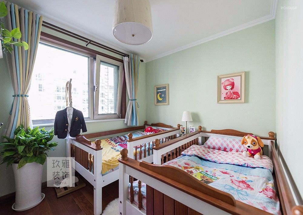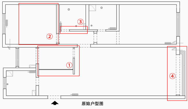 业主家有一对可爱的龙凤胎,但①②两个卧室一个大一个小,不好分配。设计师通过墙体改建将①空间扩大,在②卧室改造出一个衣帽间,缩小②卧室面积,使①②两个卧室面积基本一样大。因为目前龙凤胎的年纪比较小,还可以住在同一间卧室,在②中设置了两张儿童床,另一间卧室可暂时作为玩具房。