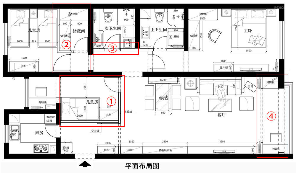 家中是业主夫妻和他们的龙凤胎宝宝一家四口居住,对储物有着明确的需求。并且,原始户型中给孩子准备的两个卧室大小不一,如何分配给龙凤胎是一个问题。