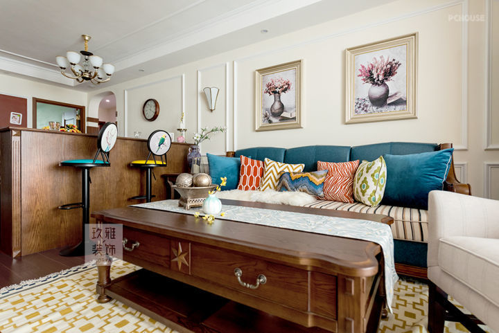 ▲客厅沙发背景墙采用美式常见的石膏线条,划分出客厅与餐厅的区域,添加不同的颜色风格,会营造出一种令人称羡的意景,让时尚、温馨、舒适变成家的一大亮点。