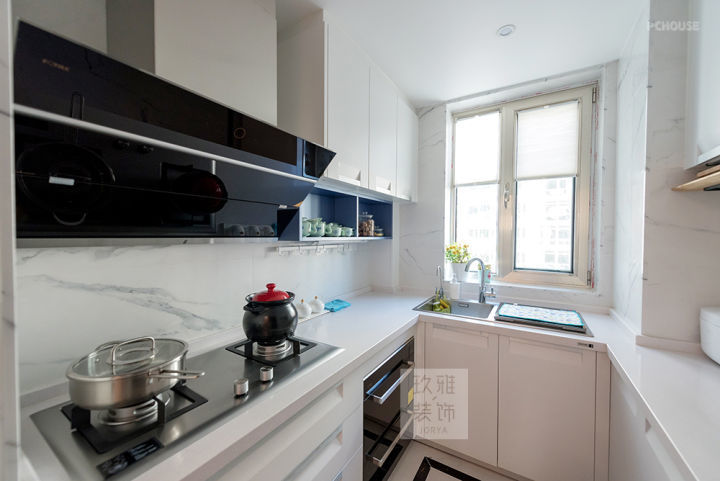 ④原始户型中没有阳台,只有一扇落地窗。业主有晾晒衣物的需求,设计师在此区域设计了一个假阳台,放置了新风机器,同时增加储物柜和电脑桌,一举多得。