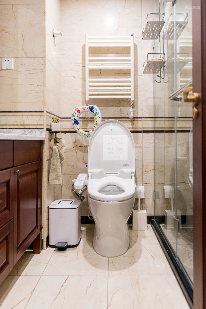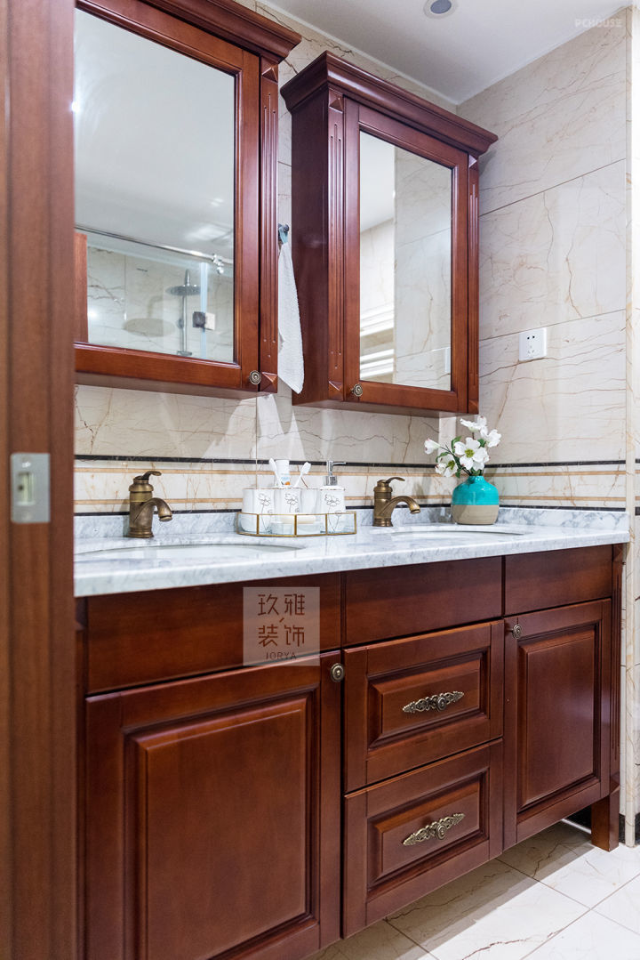 ▲浴室柜是卫生间收纳的主力军,常用的洗涤用品、抹布、刷鞋用品、多买的卷纸都会堆放在浴室柜中。封闭式镜柜整洁又美观,常用来存储护肤用品、头发护理用品等。洗漱台采用了双盆设计,夫妻俩洗漱时互不干扰。
