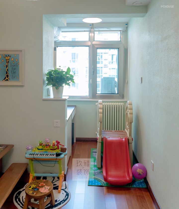 ▲在落地窗这个区域做了个假阳台,设计了栏杆满足晾晒衣物的需求,同时还可以摆放绿植。